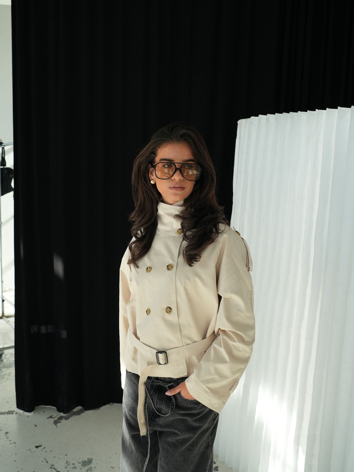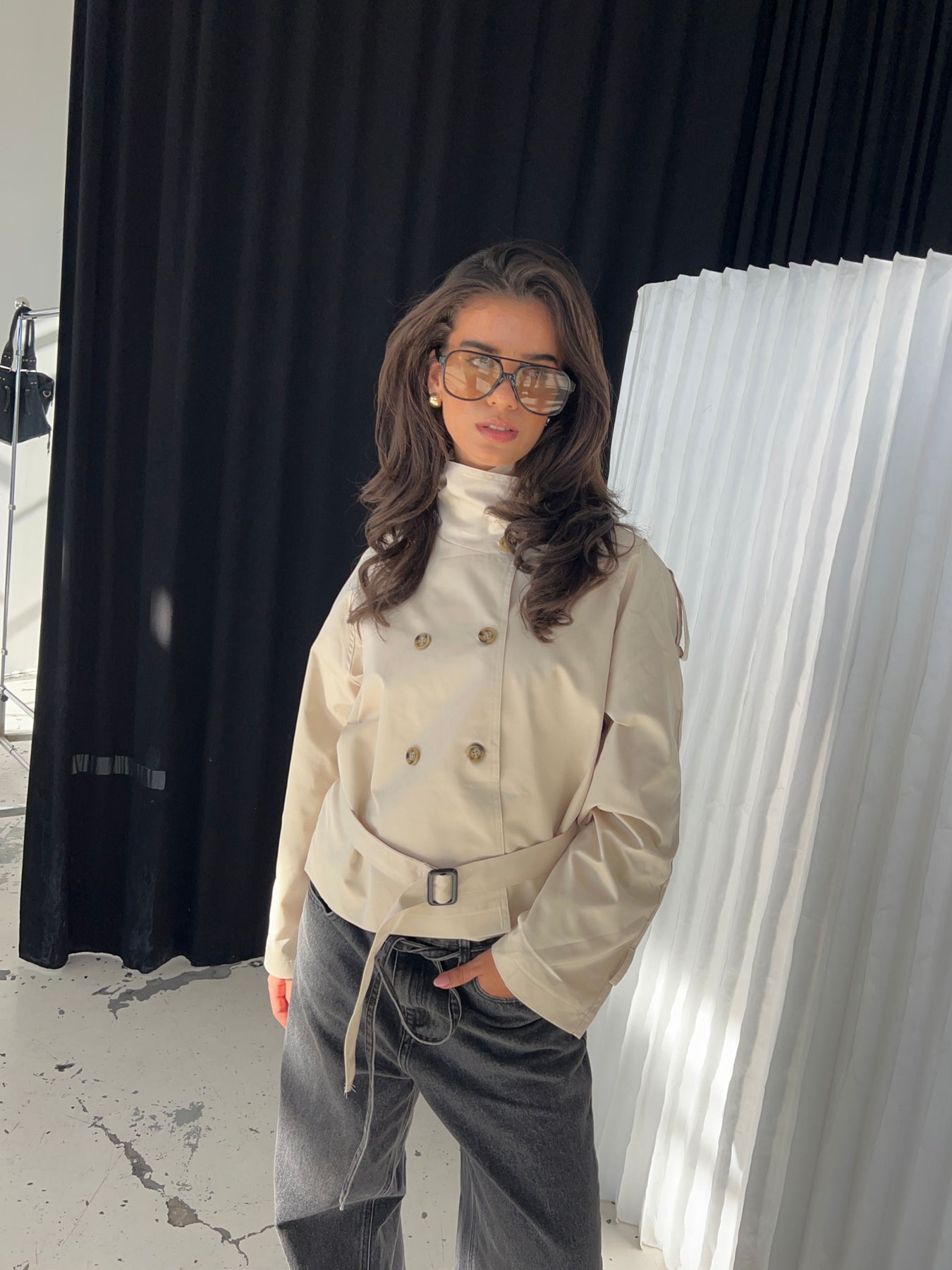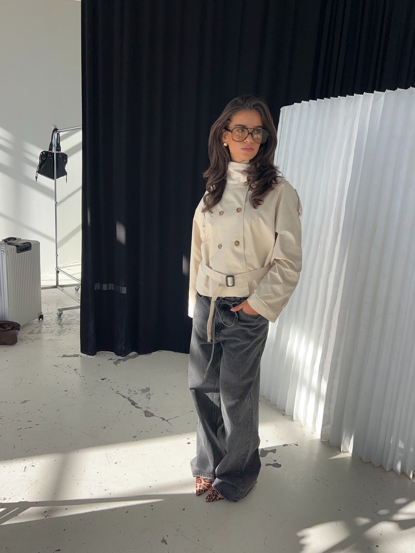 Our Zoey trenchcoat in beige is designed with a high collar and elegant brown buttons at the front, which are both practical and stylish. It has a waist tie with a buckle, so you can easily adjust the fit to your preference – whether you want it close-fitting or a little looser.