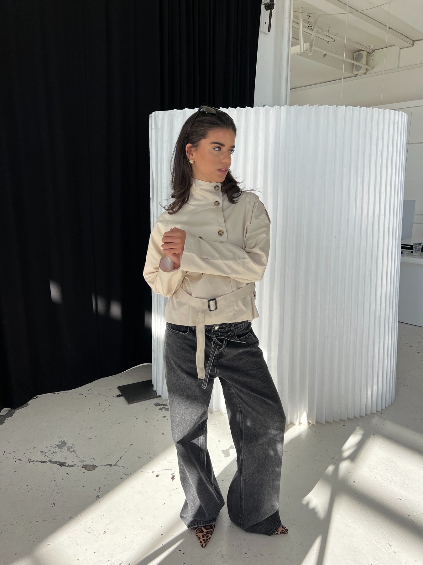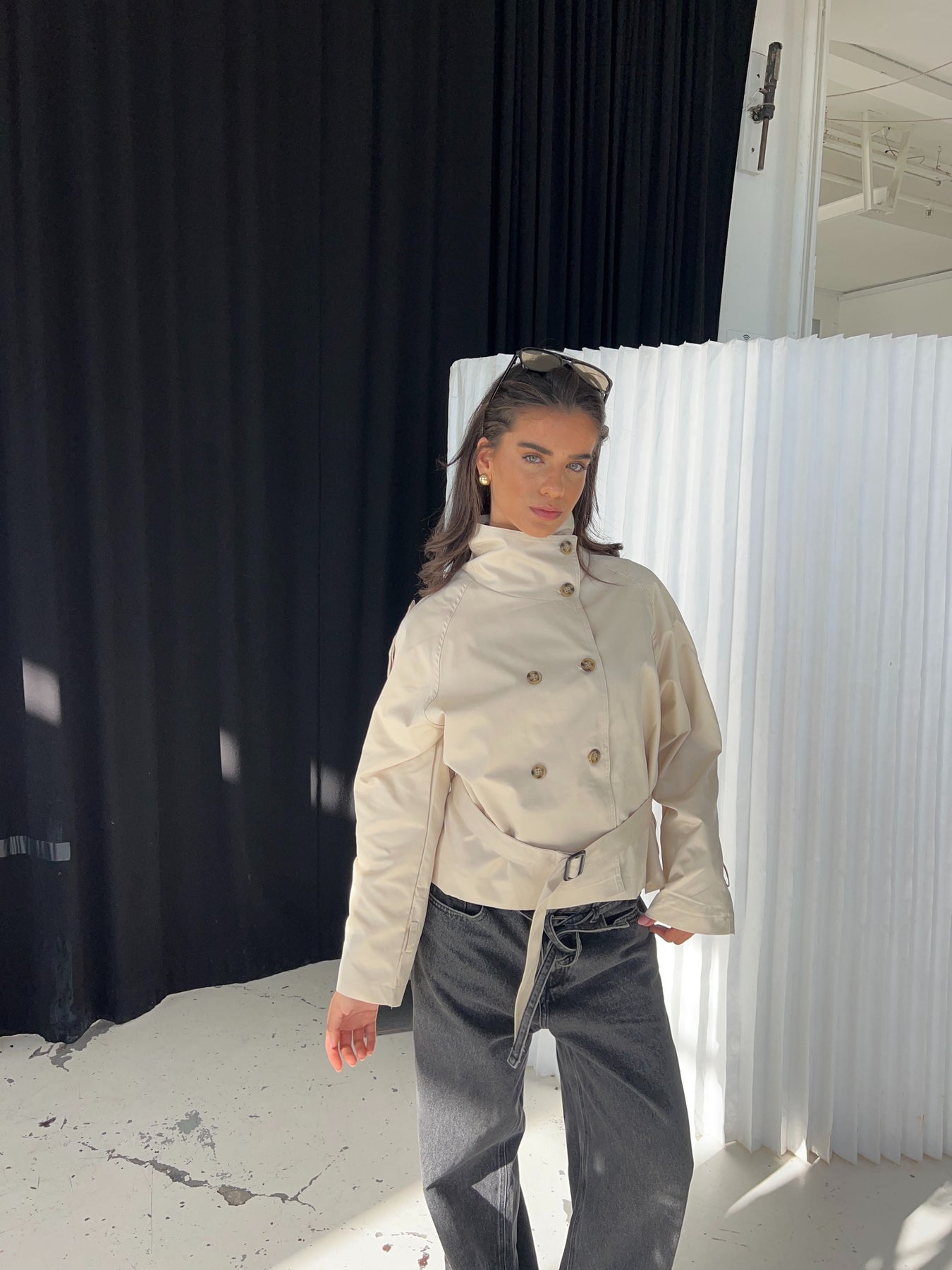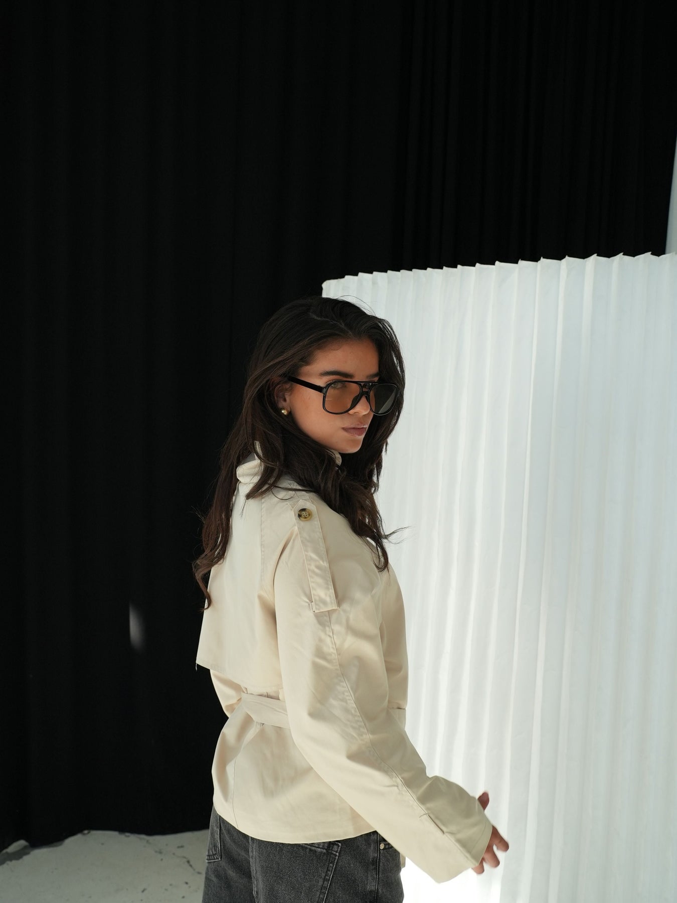 Our Zoey trenchcoat in beige is designed with a high collar and elegant brown buttons at the front, which are both practical and stylish. It has a waist tie with a buckle, so you can easily adjust the fit to your preference – whether you want it close-fitting or a little looser.