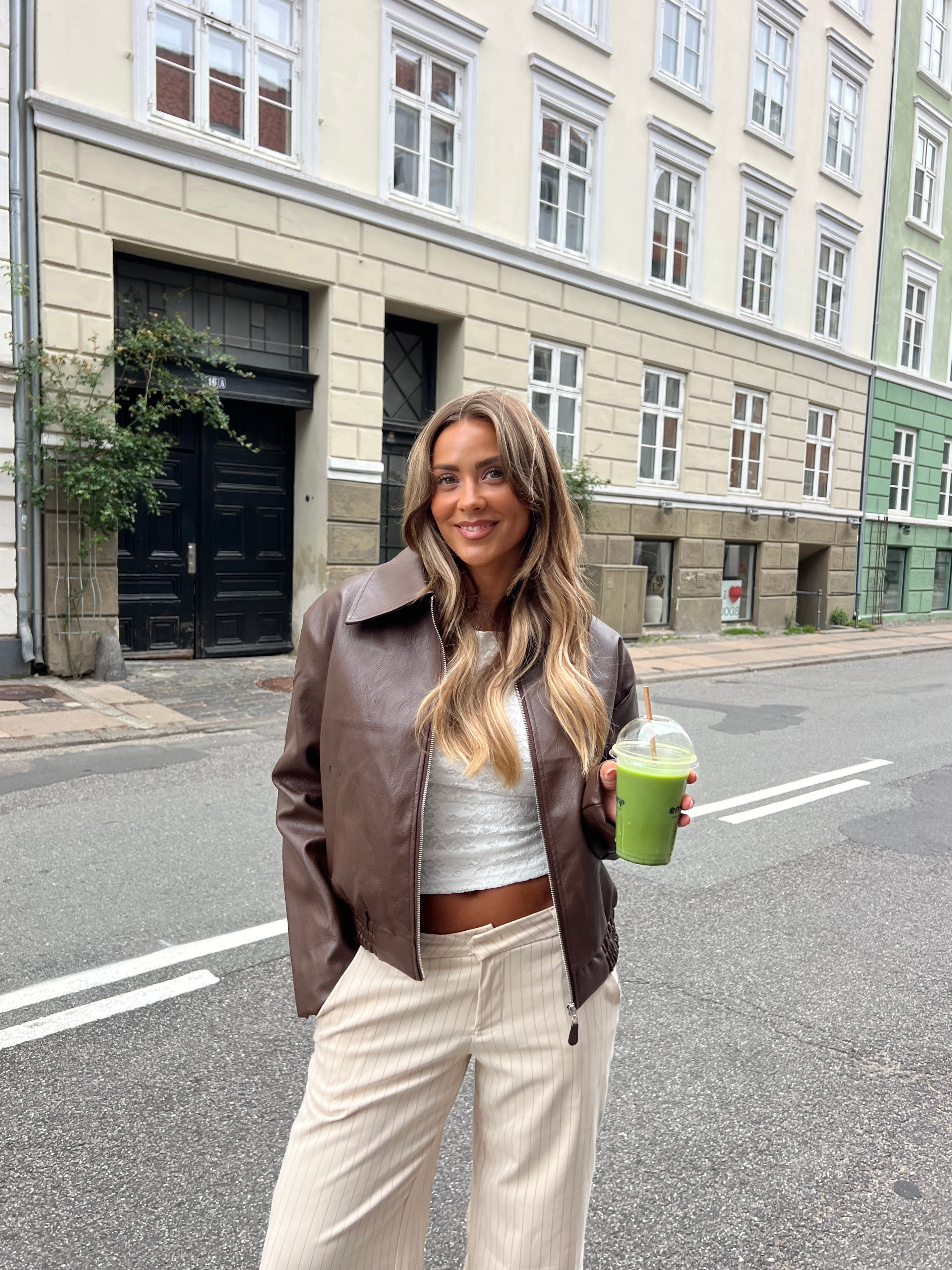 The jacket has side pockets, a front zip closure, and a collar at the neck, which gives it a more exclusive look. With its natural oversized fit, it is easy to style with everything from a knit to a simple tee. A jacket you can wear again and again, regardless of the season.