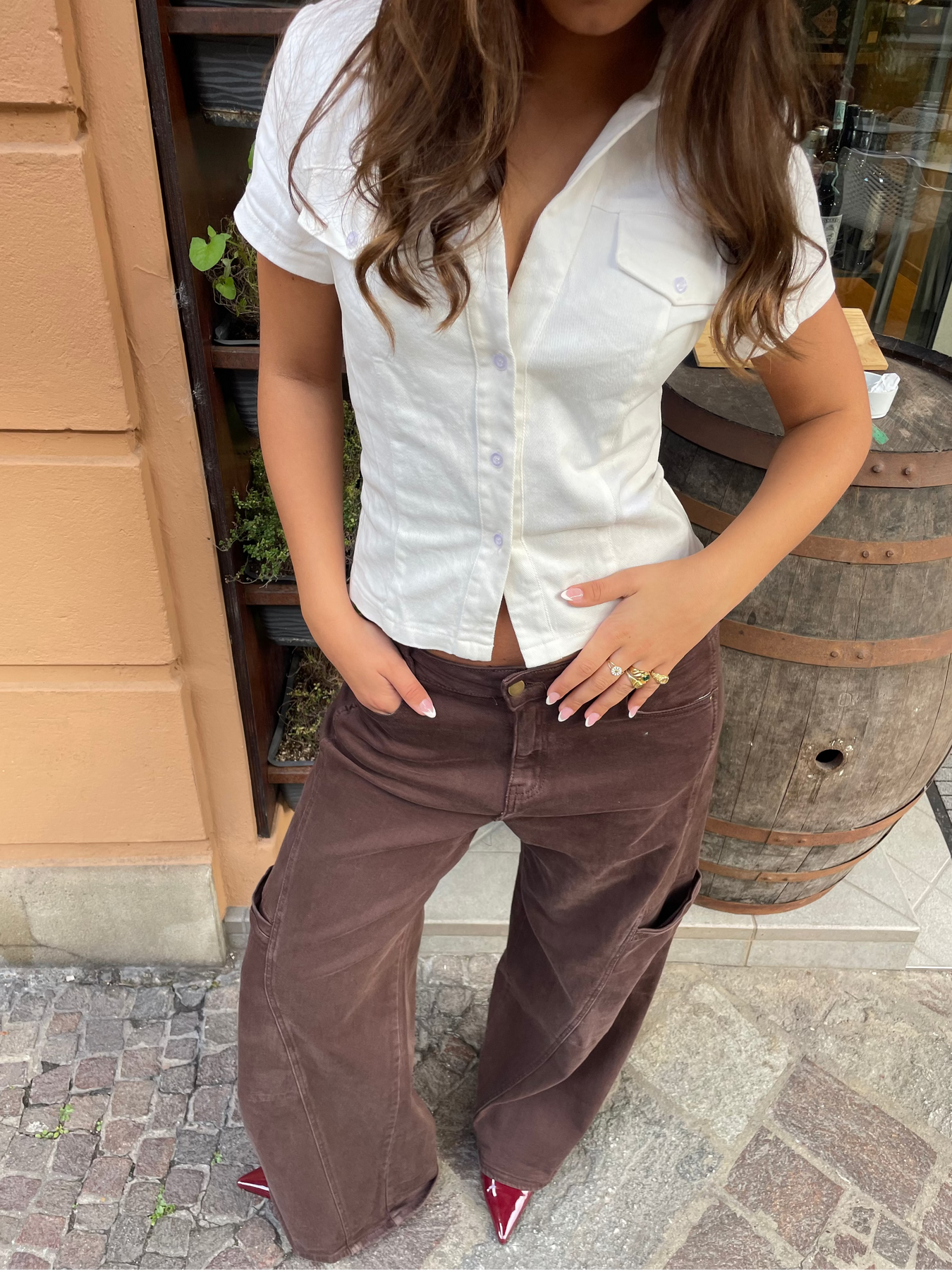 Our Elara fitted top in white is a timeless and elegant addition to your wardrobe. It is fitted for a flattering fit and has short sleeves, a V-neck, and a deep cutout for a feminine look. The button closure at the front and chest pockets add fine, classic details, while the visible stitching gives the top a modern twist. With its collar at the neck and clean lines, Elara is perfect for work, everyday wear, and events—style it with jeans, shorts, or a skirt for a stylish and versatile look.