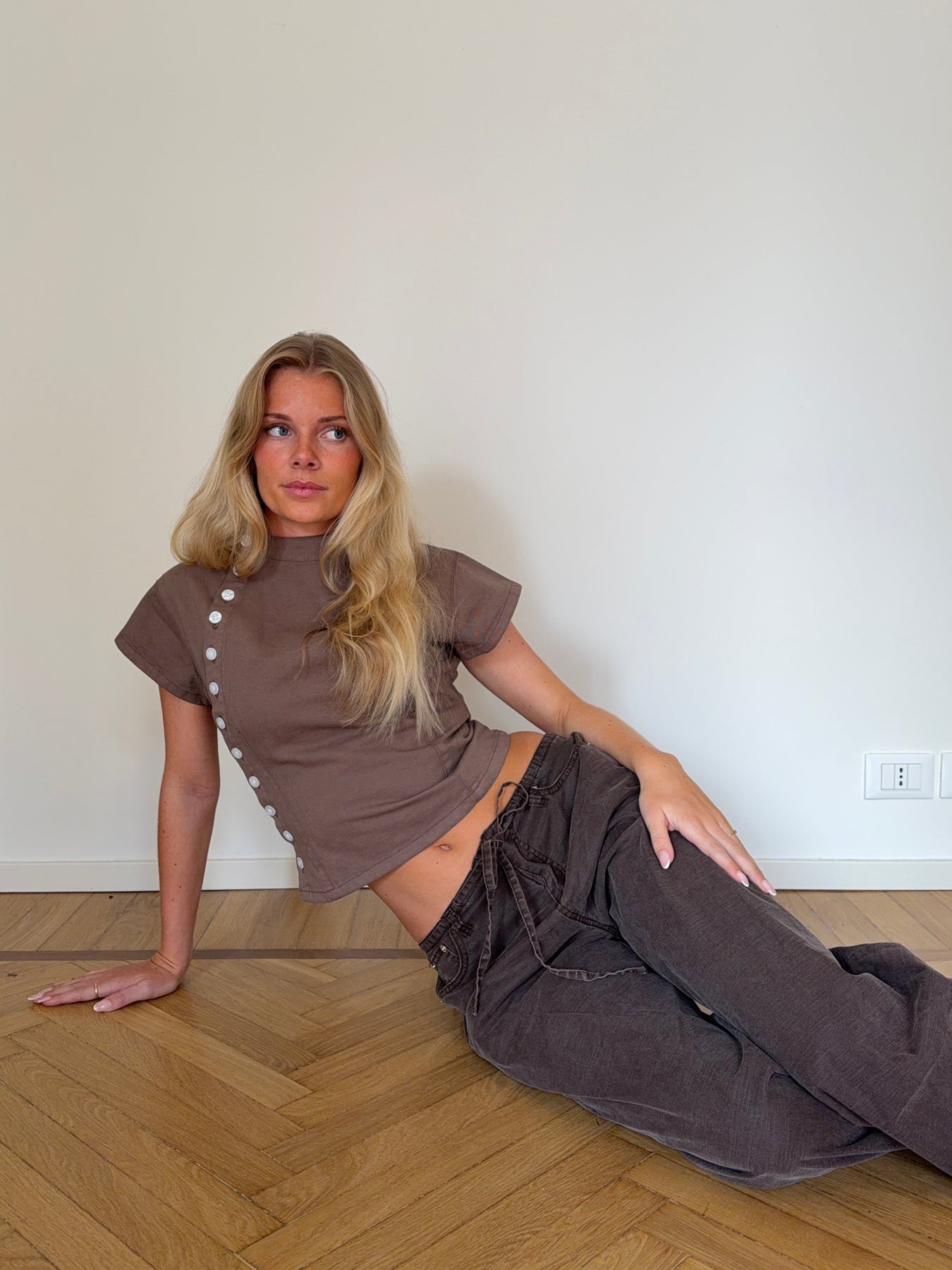 Our Kara fitted pearl high neck top in brown combines a simple design with delicate, feminine details. The top has a close fit and a slightly high neck, giving it an elegant and stylish look. It is designed with short sleeves and has a classic T-shirt-inspired look, while appearing more refined in its cut. A row of white mother-of-pearl buttons runs down the front from the neckline to the bottom of the top, adding a beautiful and decorative detail. A versatile top that can easily be styled for both everyday outfits and more elegant looks.