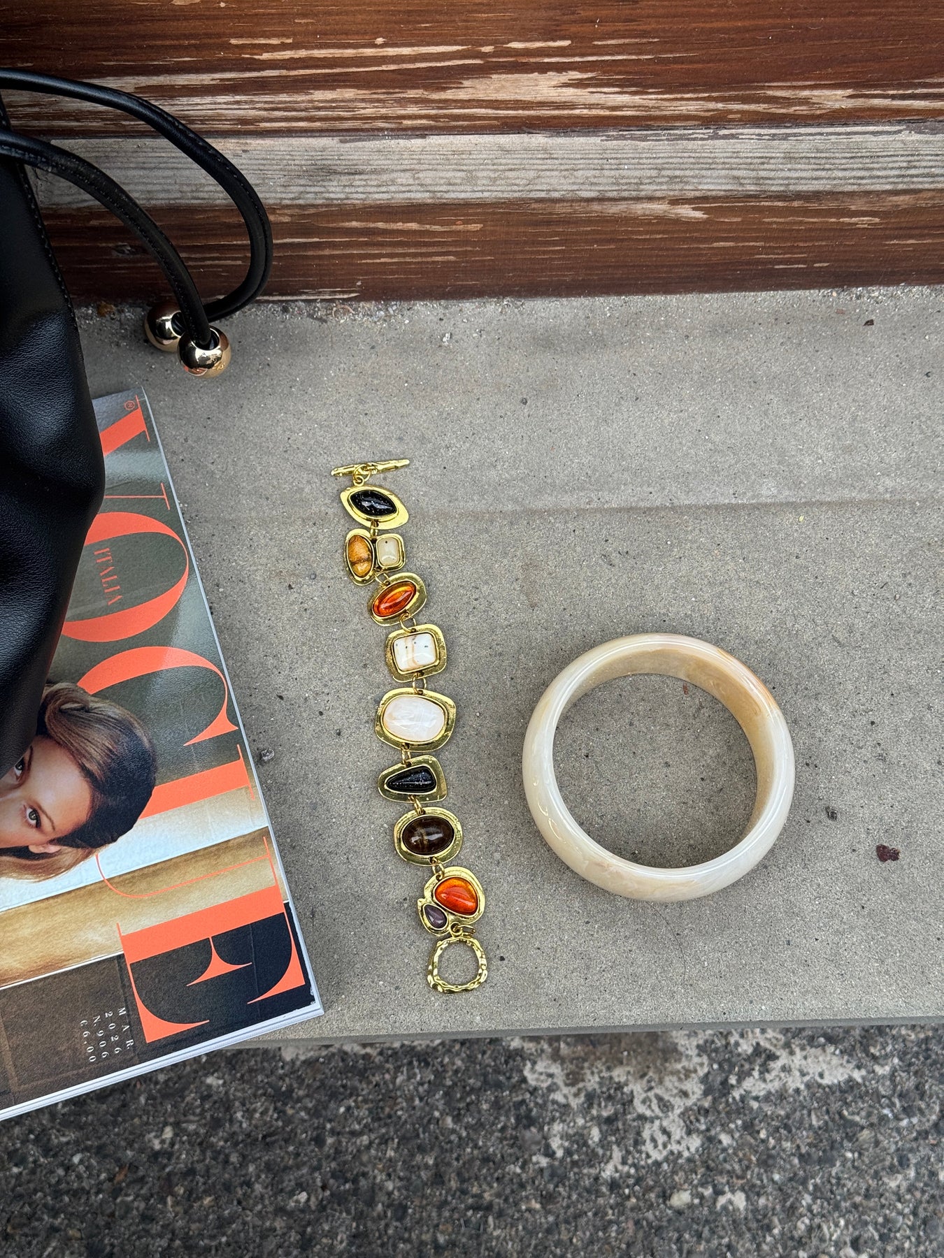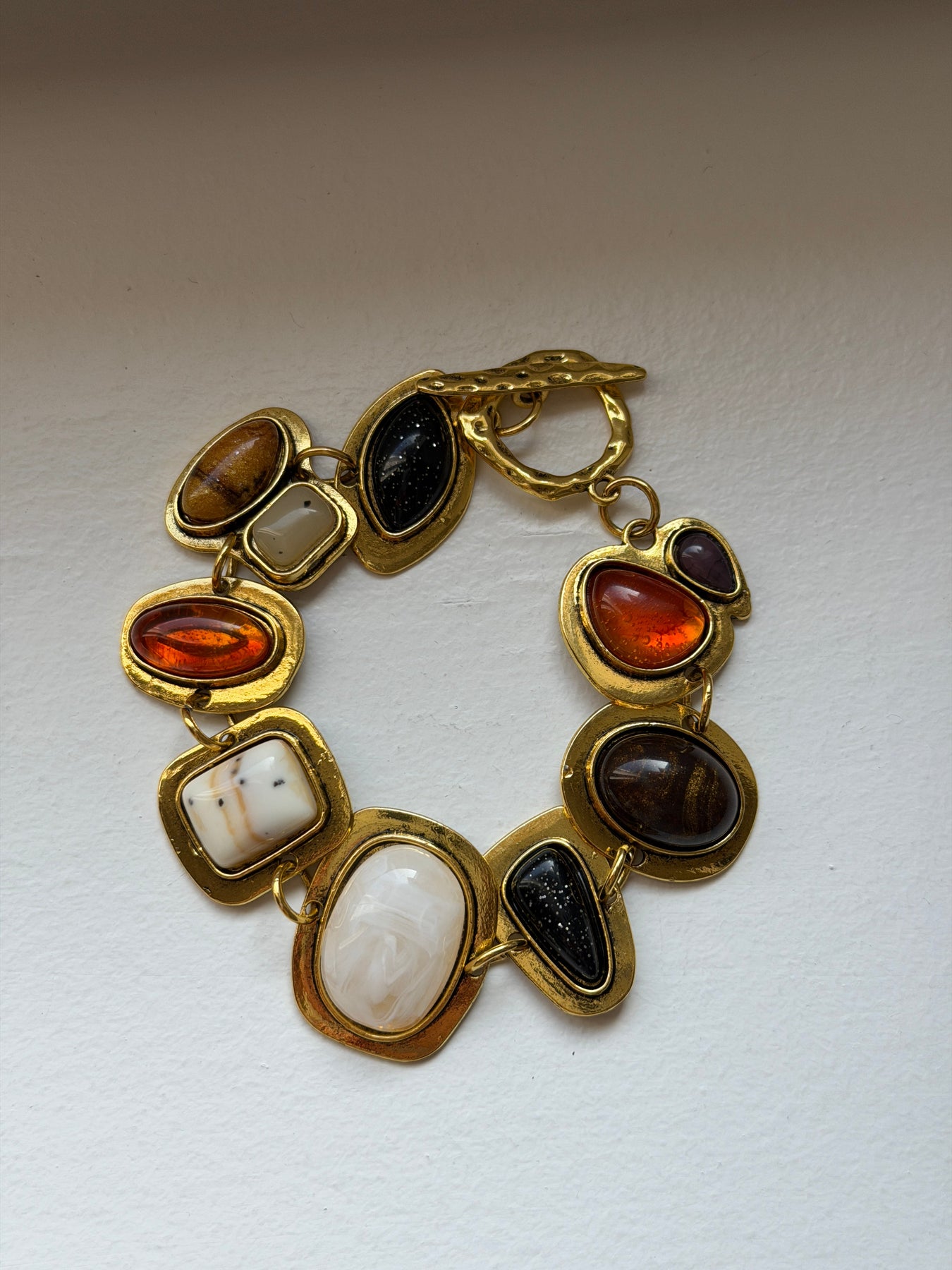 Our Xara bracelet in gold is an eye-catching piece of jewelry with a unique and artistic expression. The bracelet consists of several decorative stones in different shapes and warm shades, which together create a vibrant and elegant look. The golden frames highlight the stones and give the bracelet an exclusive touch. The combination of colours and shapes makes the jewelry a special statement piece that can elevate any outfit. Perfect for both everyday life and festive occasions.