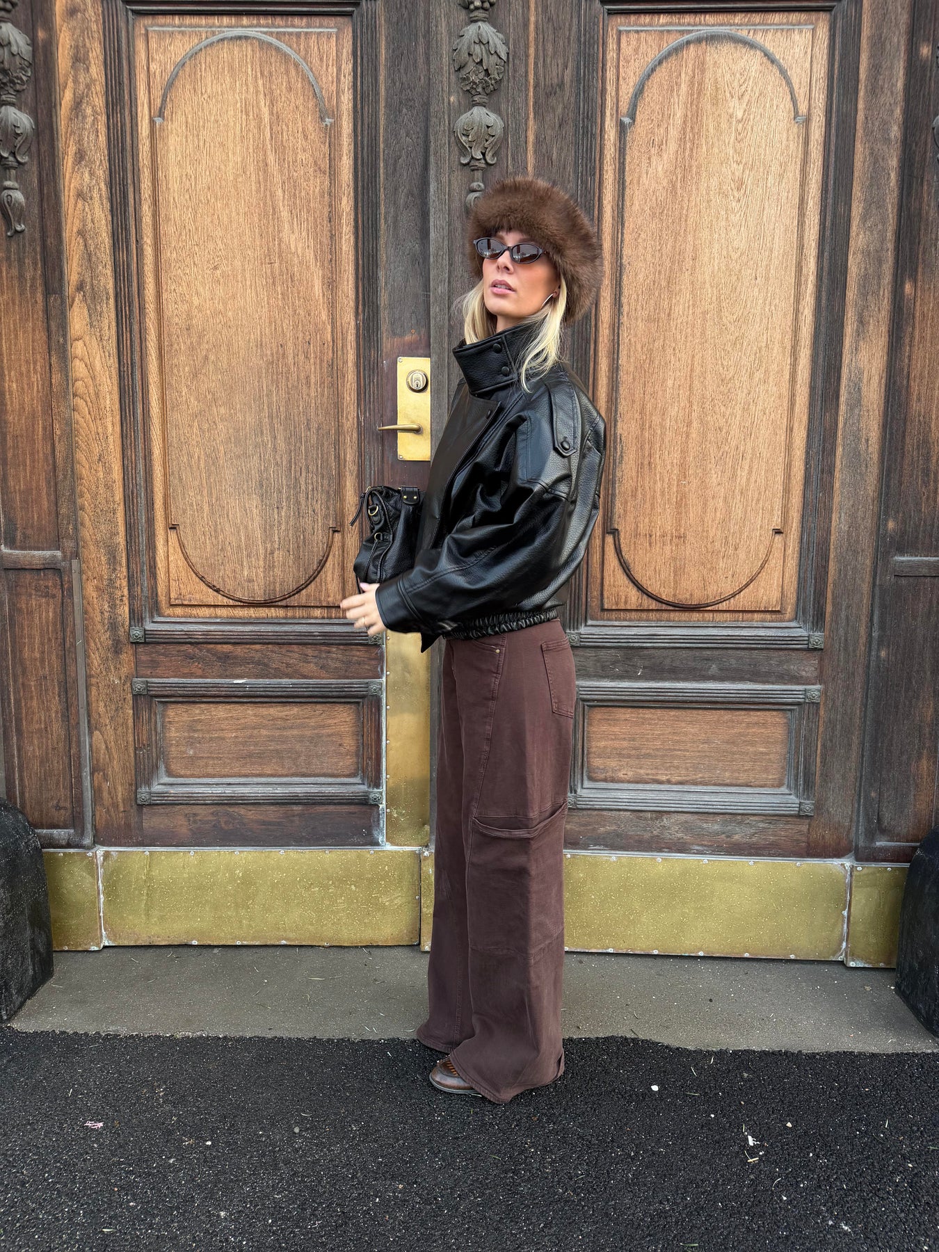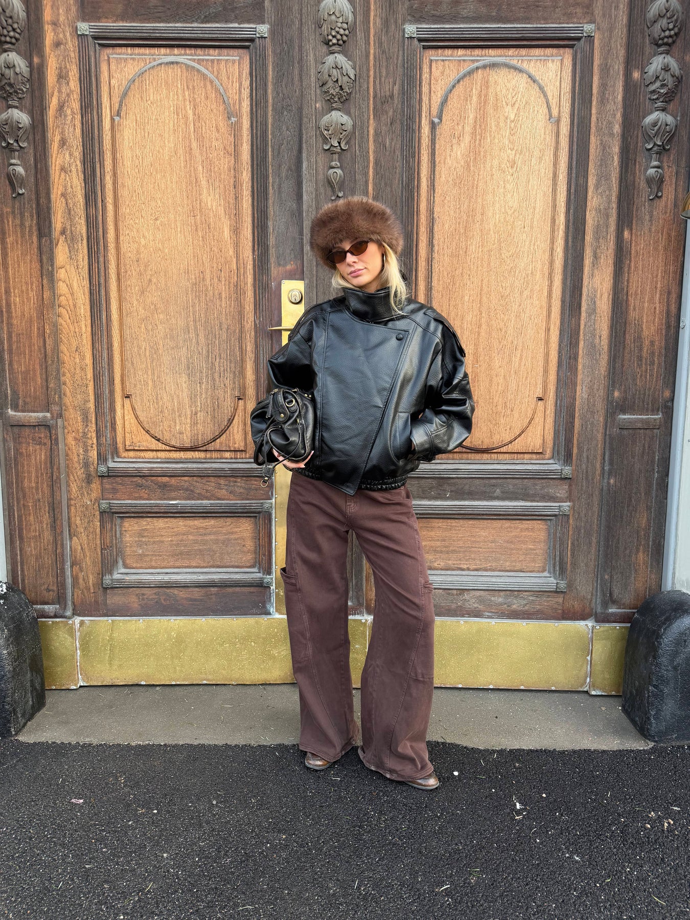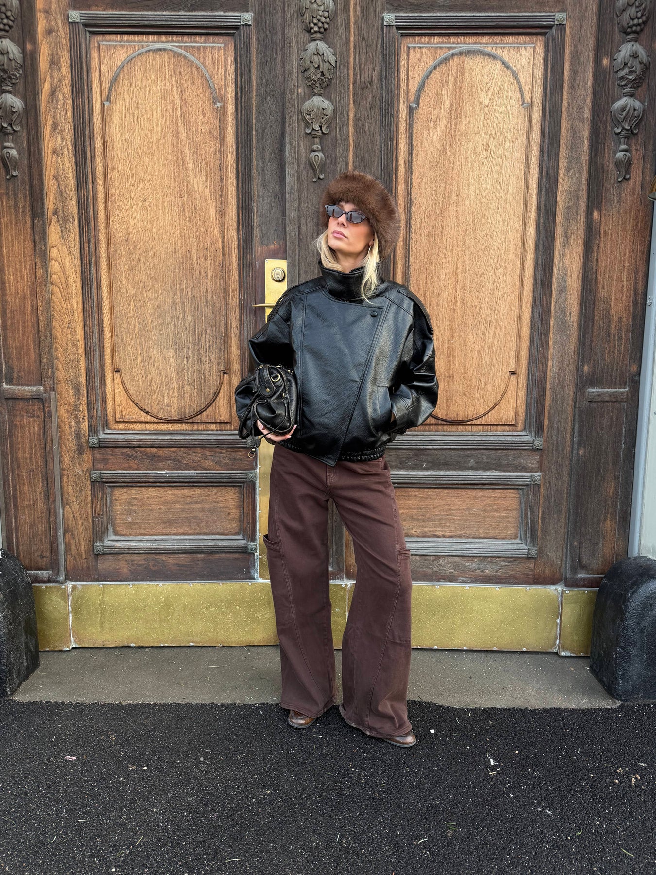 Our Linea pu high neck jacket combines a raw look with a stylish fit. The distinctive shoulder straps give it a cool, structured look, while the asymmetrical closure at the side adds a unique detail. The high neck provides both warmth and edge, and the material has a luxurious, slightly shiny surface that makes the jacket extra eye-catching.