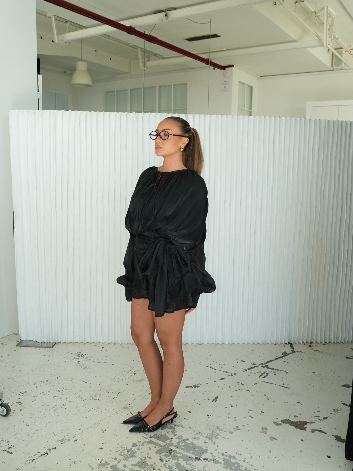 Our Kalia mini dress is the epitome of femininity mixed with pure elegance. The dress is designed in a light, shiny material that falls beautifully and creates an airy look. It has long, loose-fitting sleeves with buttons at the end and a tie at the waist that flatters the figure. The short, layered skirt gives the dress a romantic and playful look and is perfect for any occasion, whether you're going to a party or just out for the evening.
