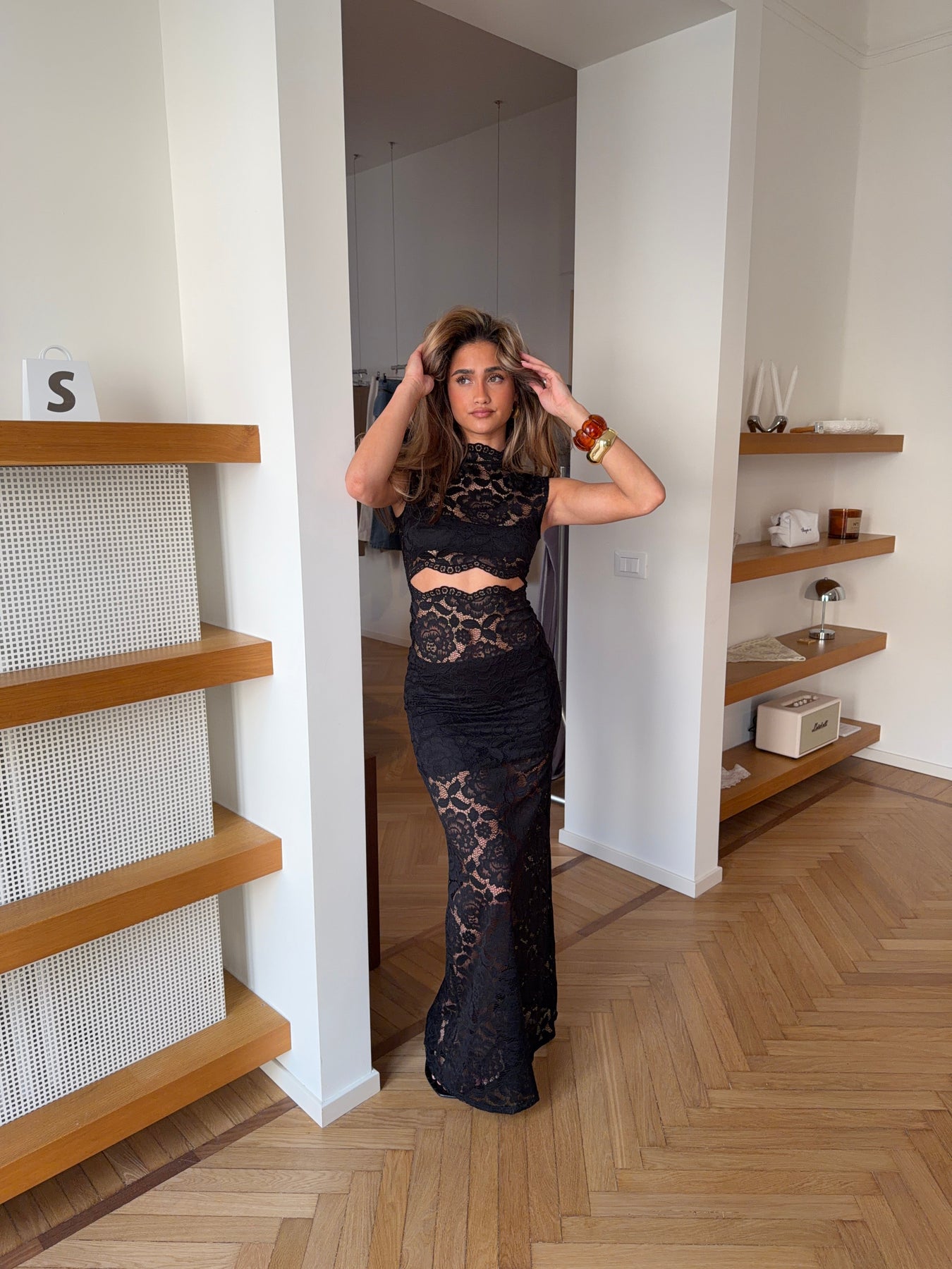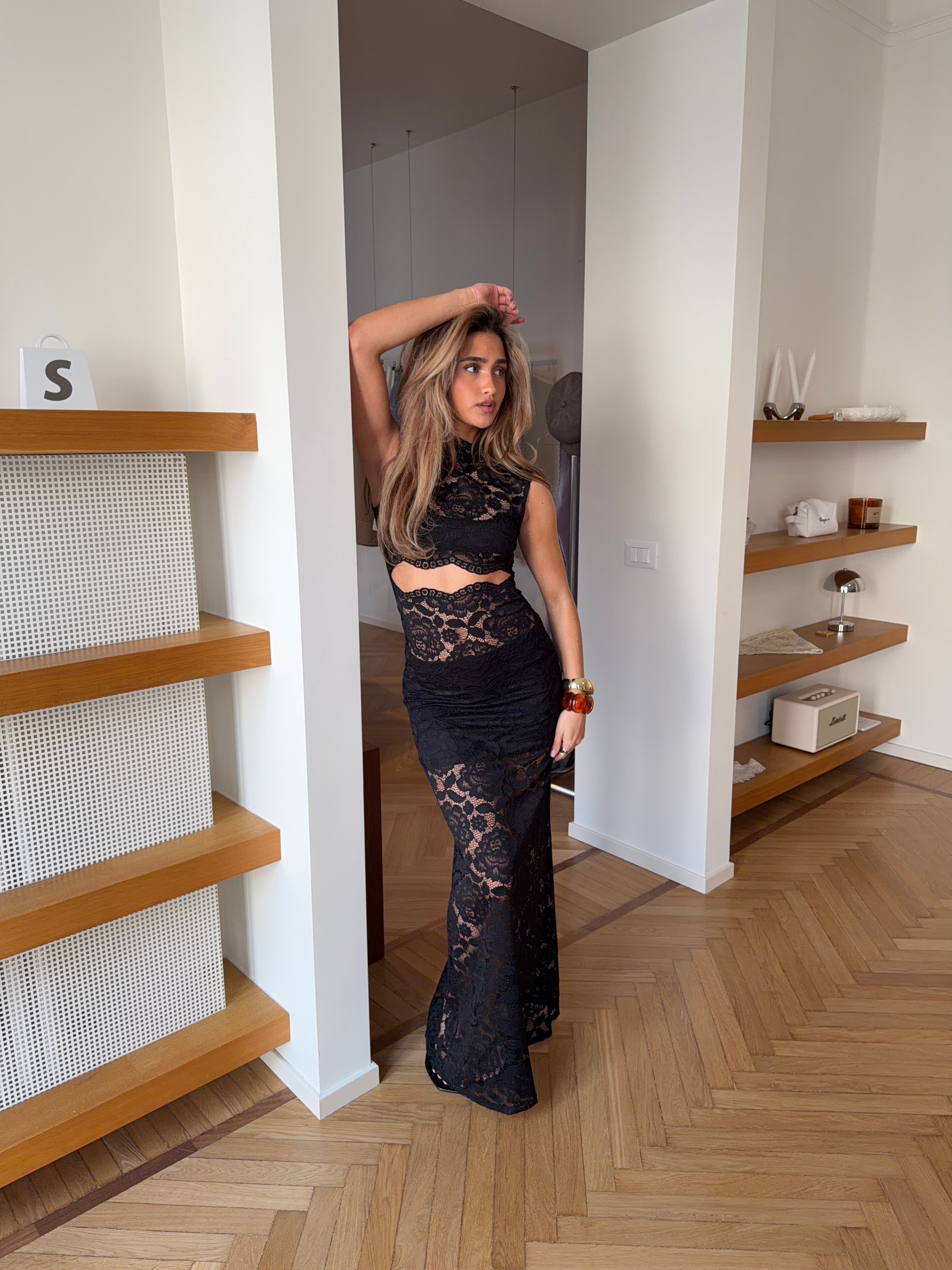 The Lydia lace maxi dress in black has an elegant and feminine look thanks to its beautiful lace fabric. The dress features a high neckline and delicate cut-out details at the waist, as well as an inner bandeau and mini skirt. The long silhouette drapes beautifully along the body and flatters the figure in an elegant way, while the lace fabric adds a romantic and exclusive touch. Perfect for festive occasions when you want a sophisticated and eye-catching look.