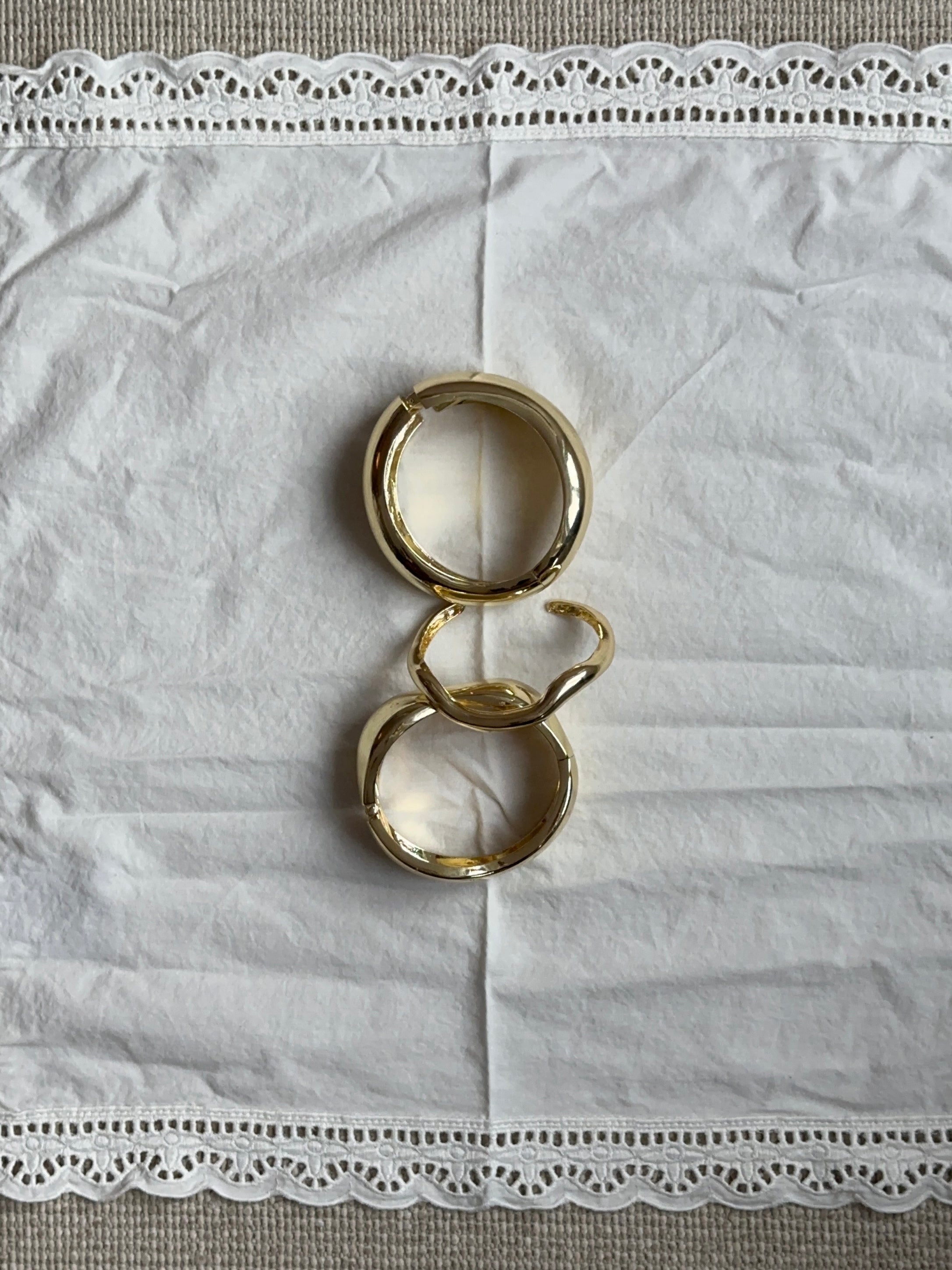 Our Niva bracelets in gold are an elegant set consisting of three unique bracelets, each with their own shape and expression. The combination of the classic round design and the more organic, undulating shapes creates an exciting and dynamic look on the wrist. The shiny gold finish gives an exclusive look and reflects the light beautifully.
