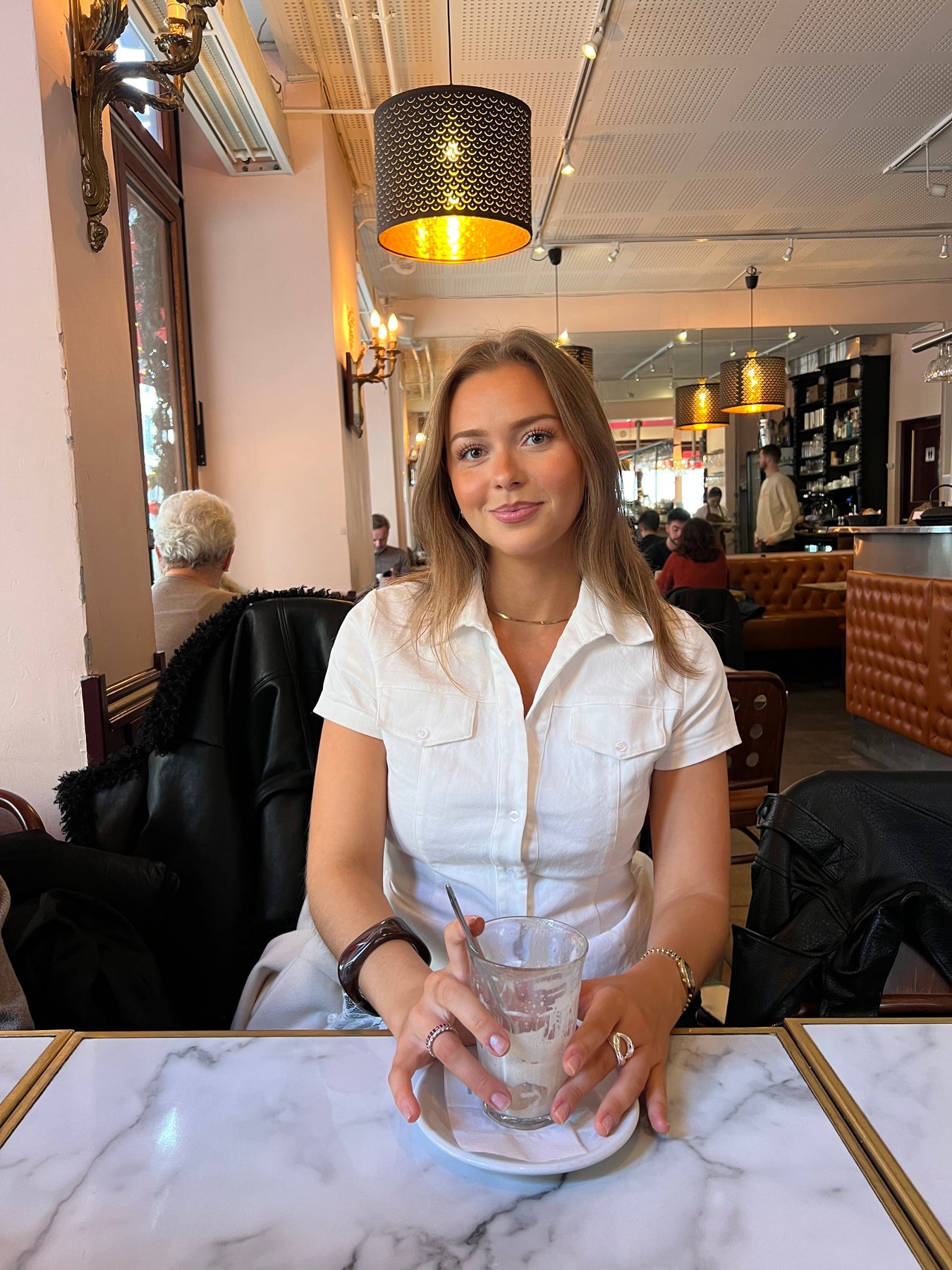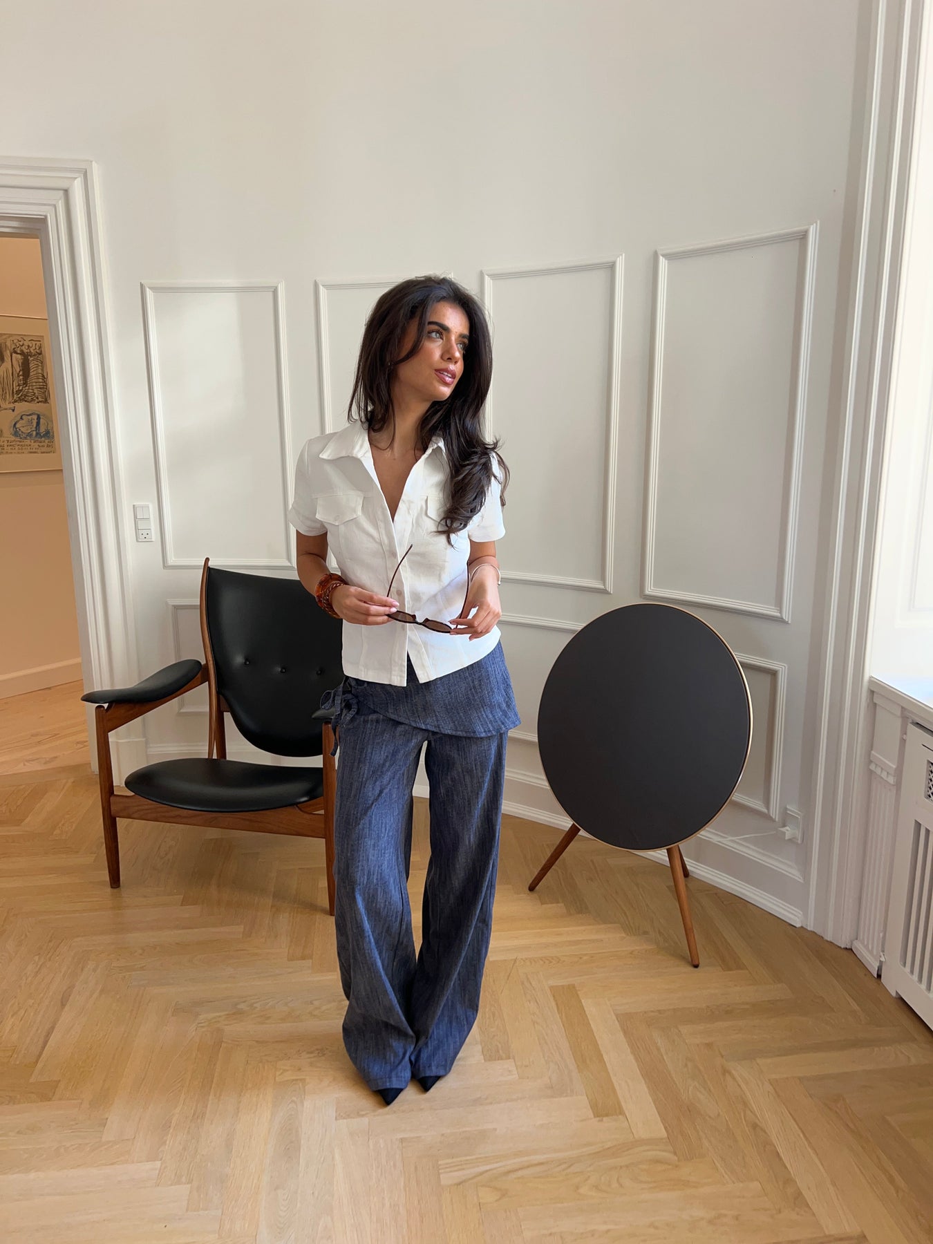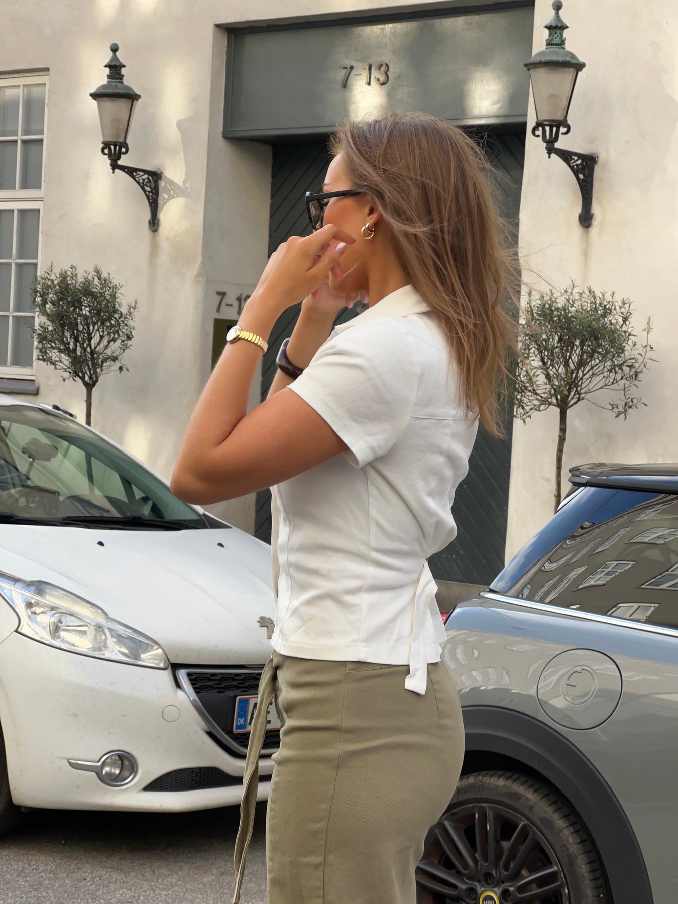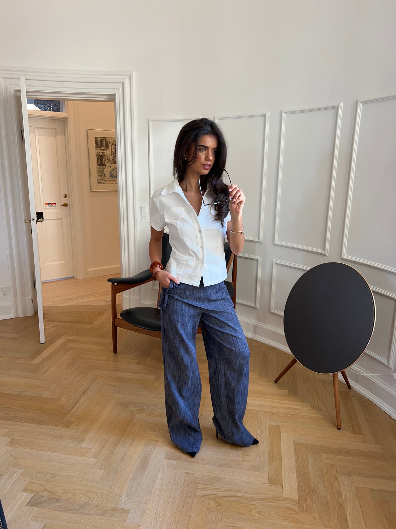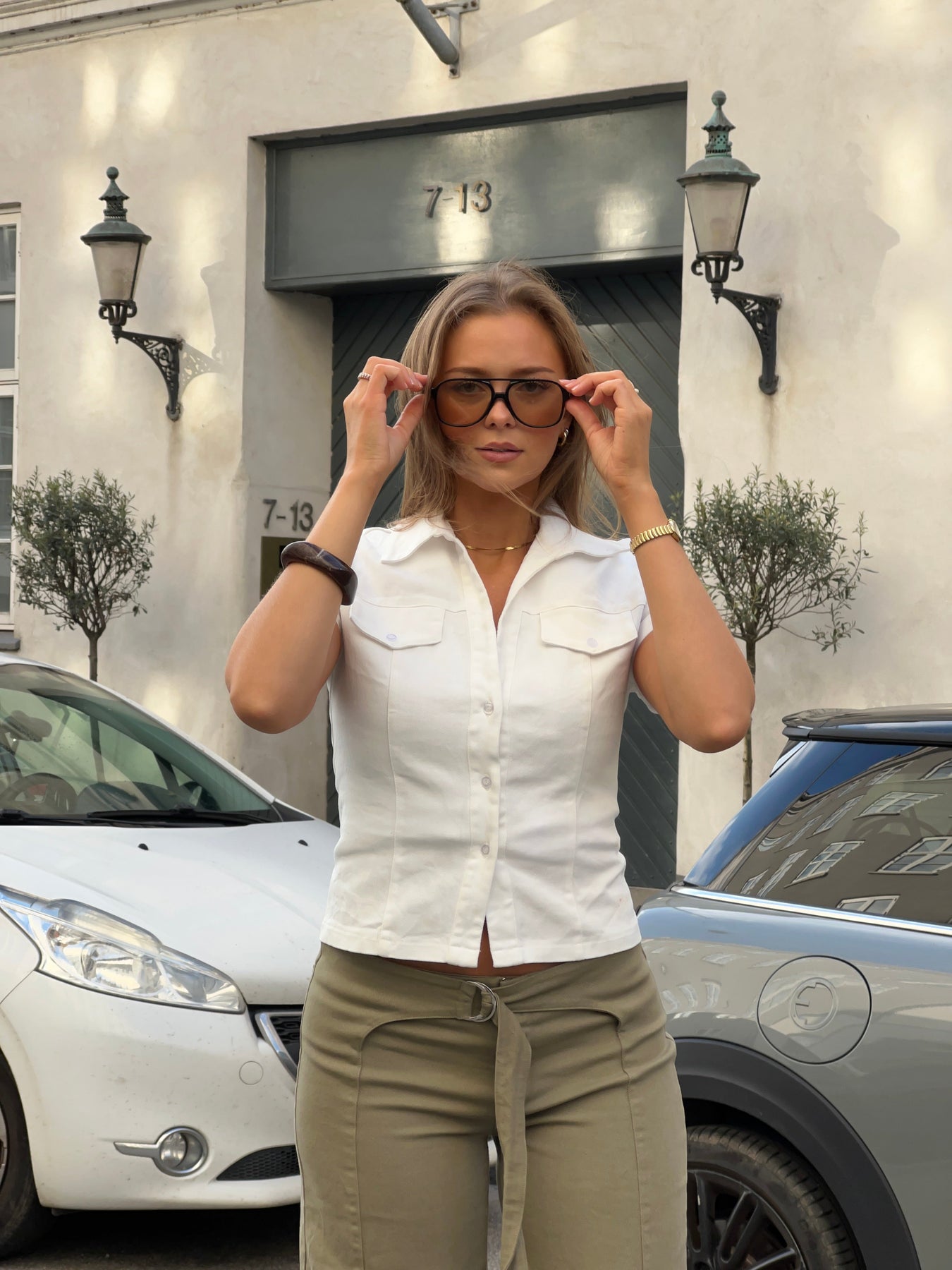 Our Elara fitted top in white is a timeless and elegant addition to your wardrobe. It is fitted for a flattering fit and has short sleeves, a V-neck, and a deep cutout for a feminine look. The button closure at the front and chest pockets add fine, classic details, while the visible stitching gives the top a modern twist. With its collar at the neck and clean lines, Elara is perfect for work, everyday wear, and events—style it with jeans, shorts, or a skirt for a stylish and versatile look.