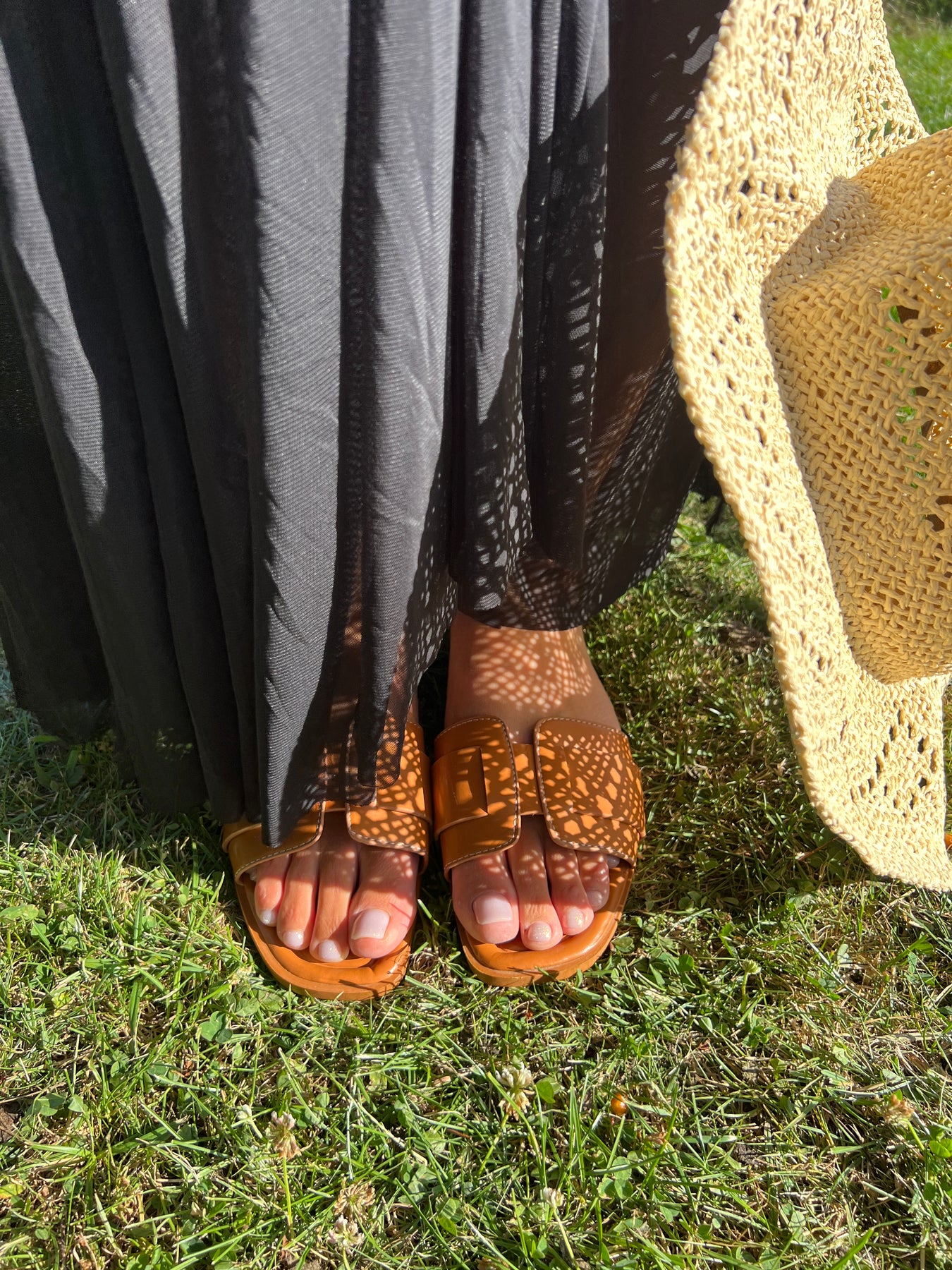 Our Ella sandals, which are perfect with a dress or a pair of jeans. The sandals come in brown, white and black and denim ✨