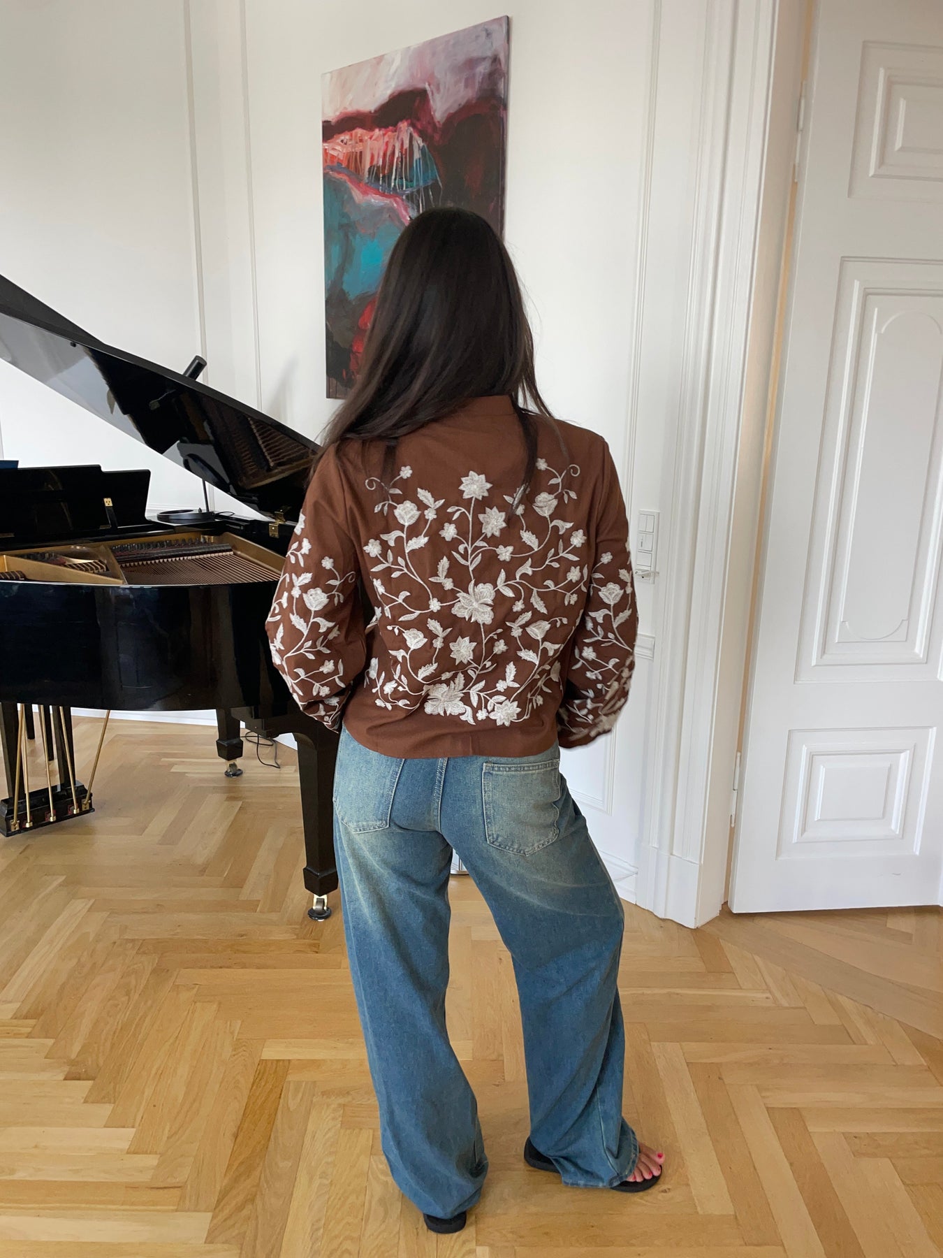 The Emma balloon sleeve shirt in dark brown features exquisite white embroidery, giving it a light and unique look. It has buttons down the front and can be styled buttoned up or open like a cardigan. It is made from 100% polyester without stretch, giving it a relaxed and comfortable fit. The beautiful balloon sleeves give the shirt a little extra character and make it perfect for both everyday wear and special occasions 🤎