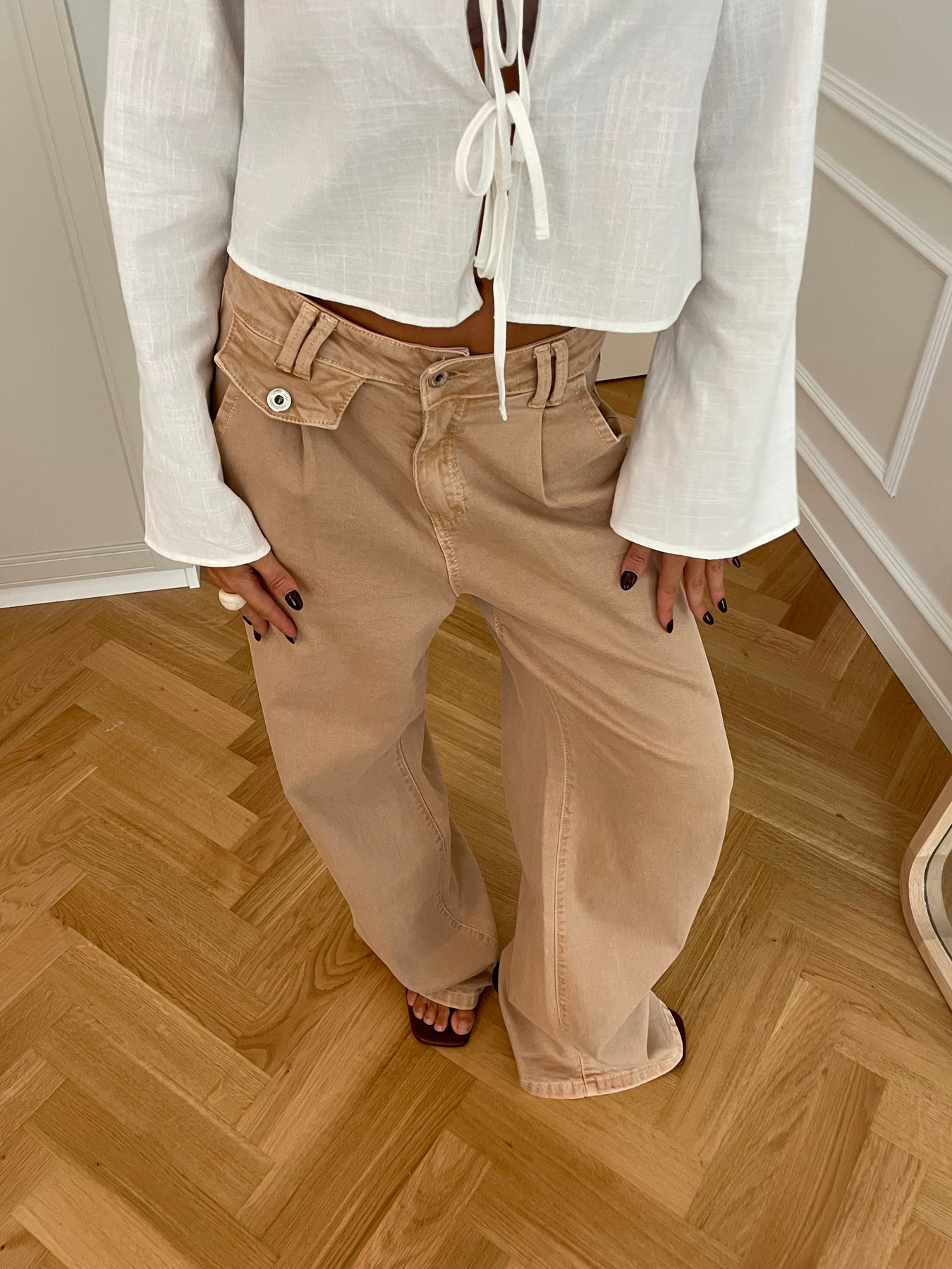 The Esme baggy jeans are for those who love a relaxed and cool look. They feature a baggy fit with unique front details, pleats at the sides, and a double belt loop that adds a little extra edge. With a front zip and button closure plus functional pockets, they are both practical and stylish. Perfect to style with a simple top or cropped tee for an easy and elegant everyday outfit.