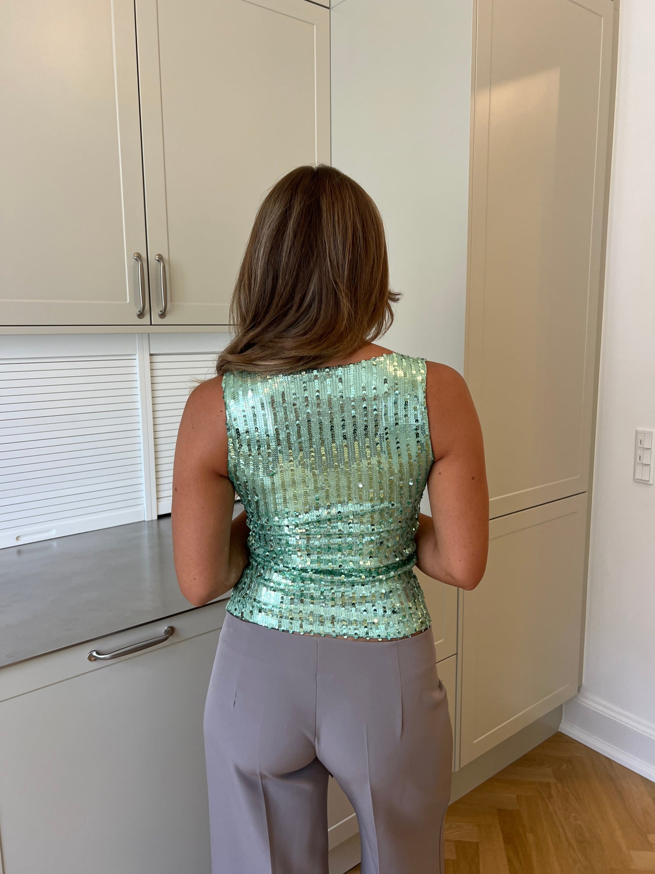 The Francesca sequined V-neck top is a close-fitting and flattering sequined top that highlights your figure in a simple and elegant way. The top has a soft inner lining under the bust that makes it opaque. The top comes in the most beautiful light green color and will make any outfit shine. Perfect for a night out on the town💚