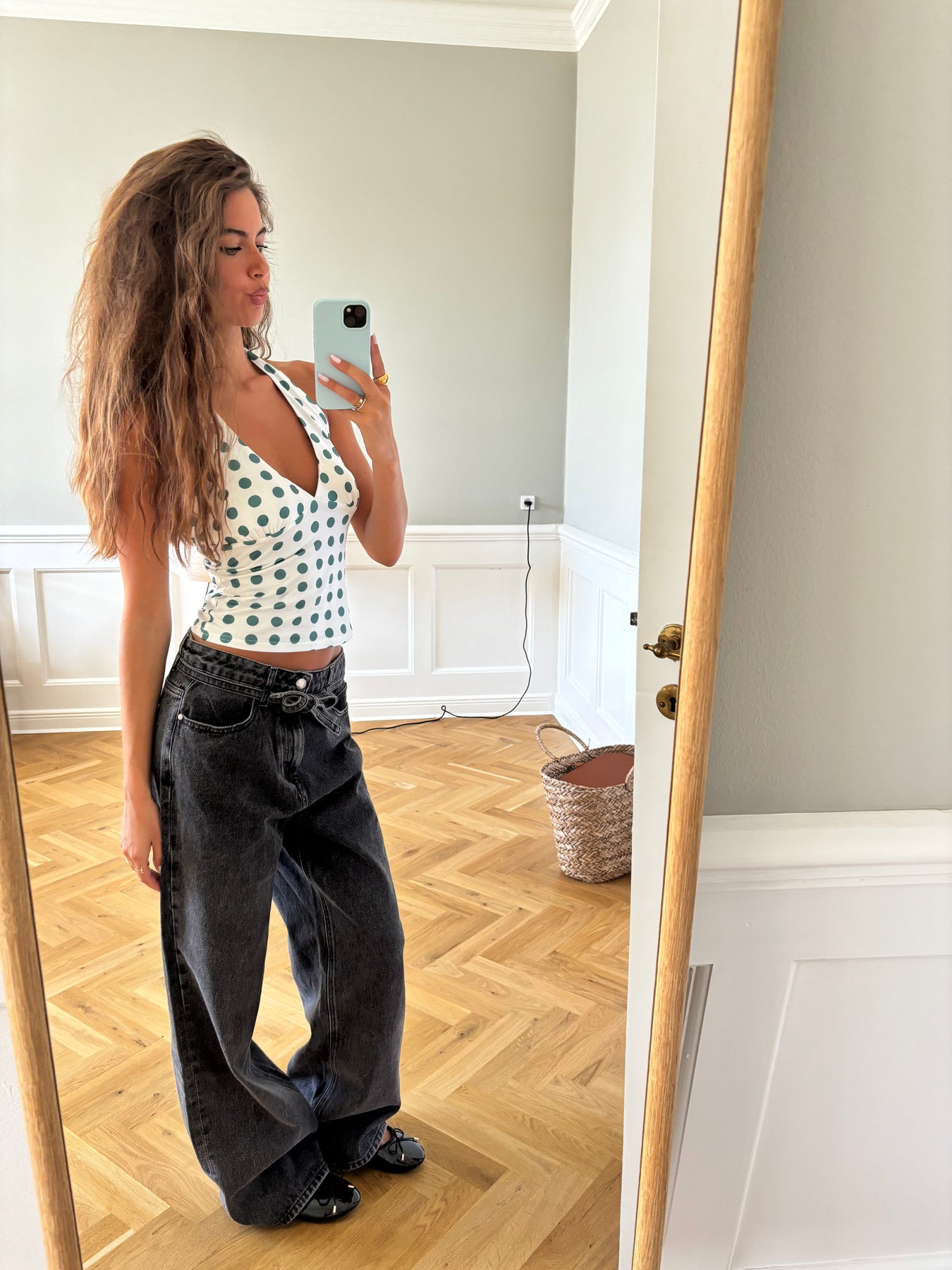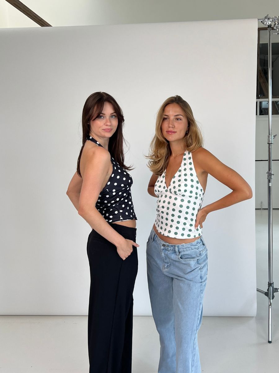 Our Ophelia top in white/green is a close-fitting, stretchy top with the finest green polka dots and a beautiful V-neckline that gives it a feminine look. It has a half-open back and fastens at the neck, adding a nice detail at the back. A versatile top that can easily be styled up or down – whether you're going to a party or just want to spice up your everyday look.