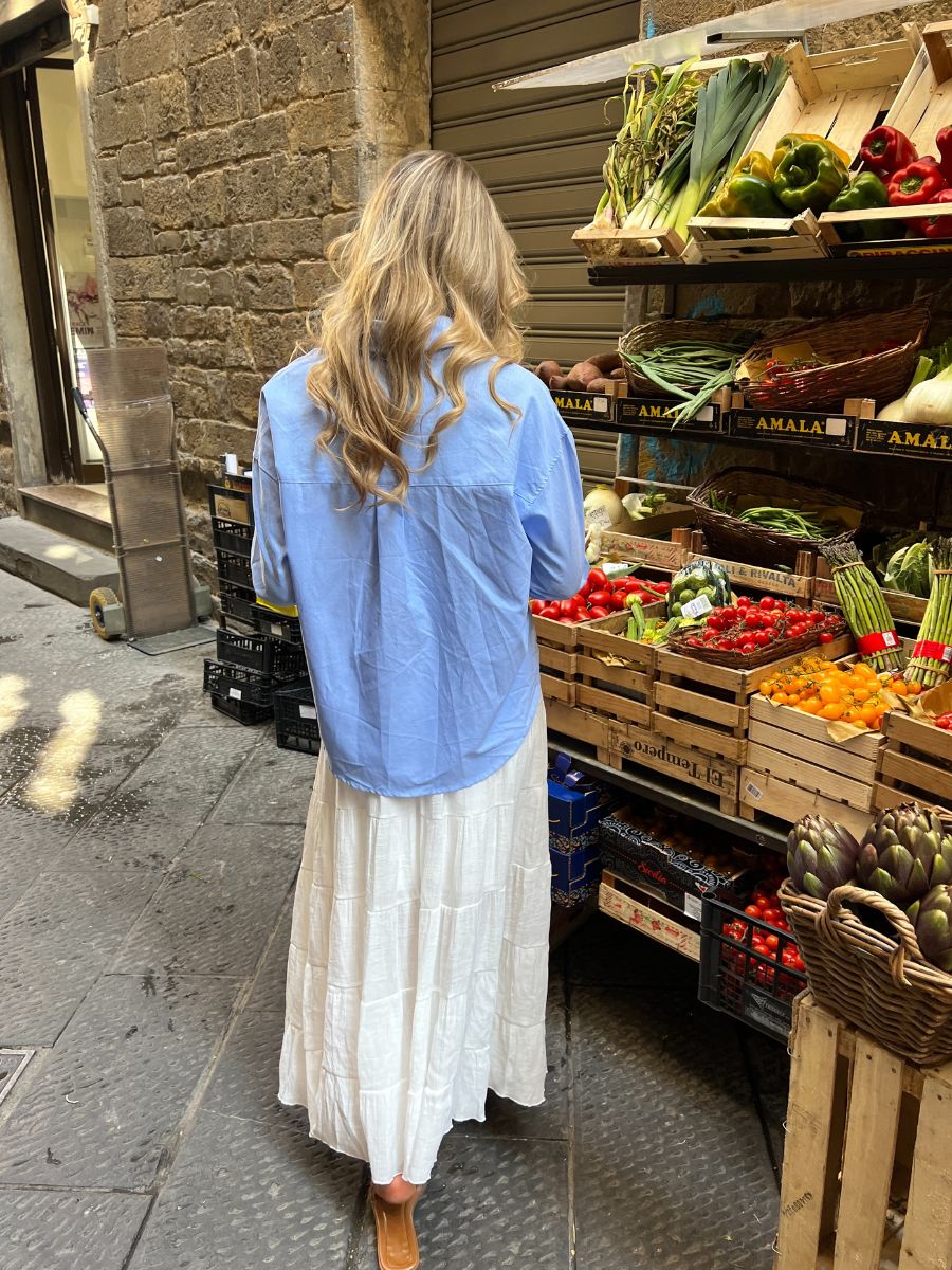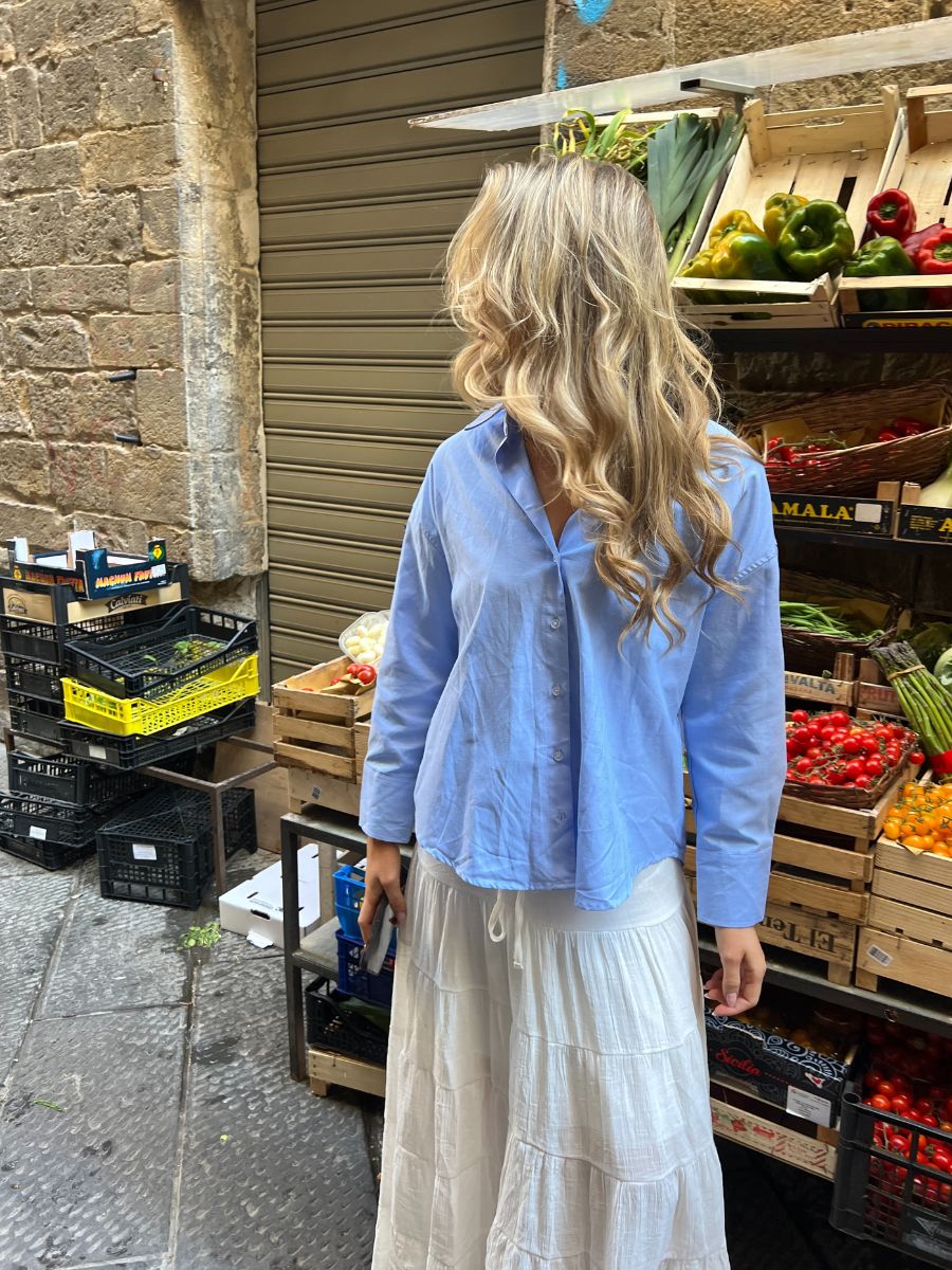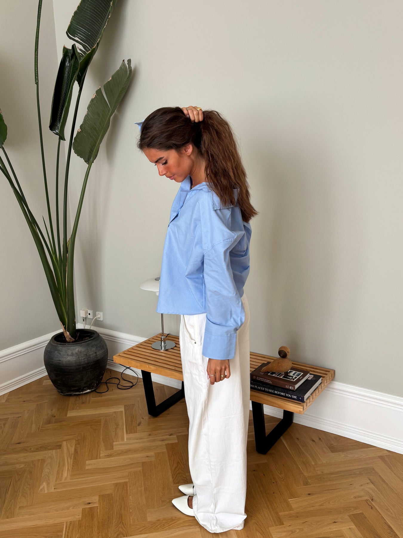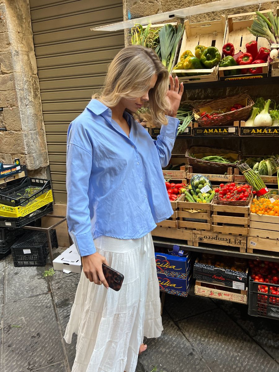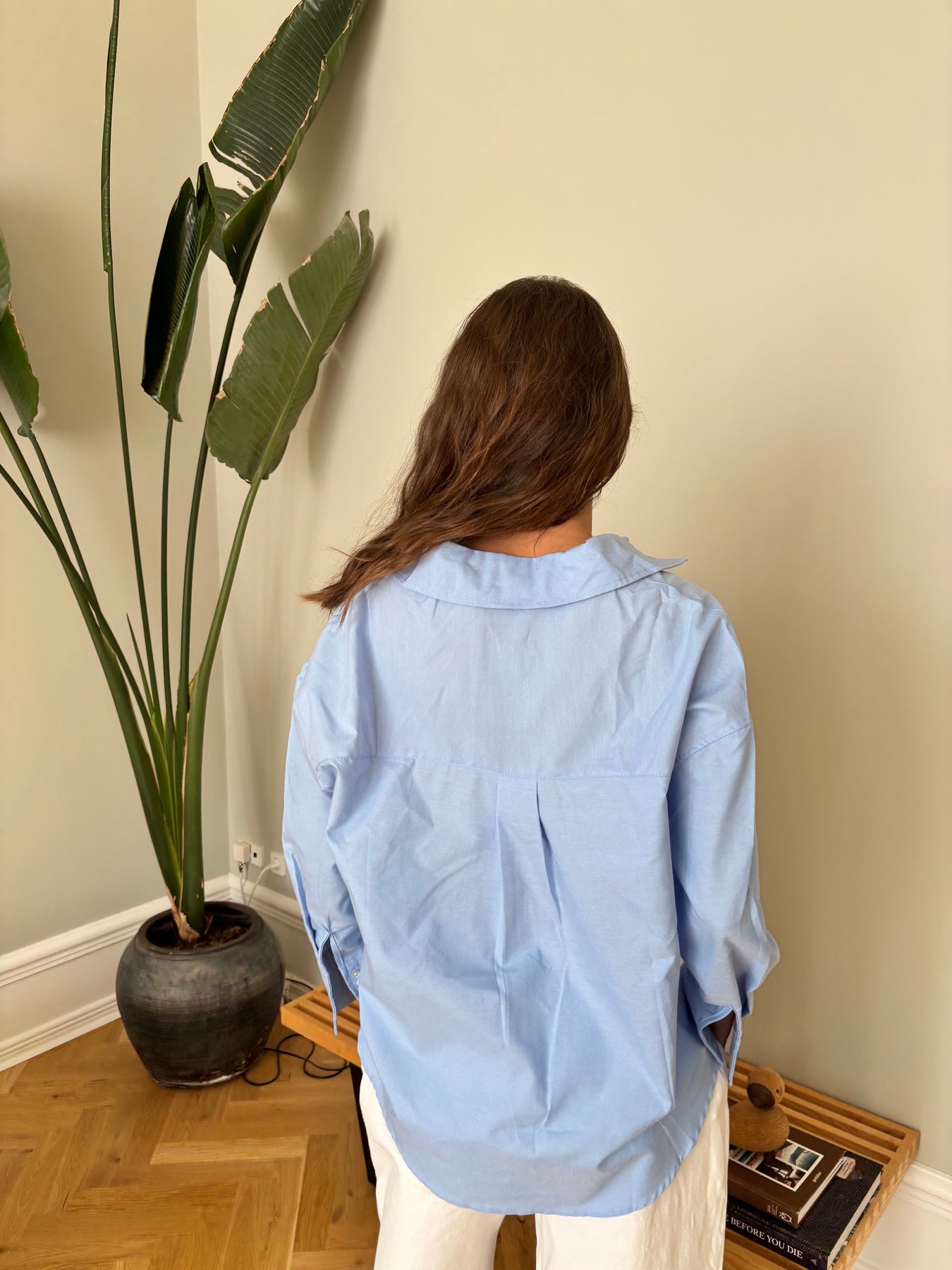 Our stylish Thalia shirt in a beautiful blue color - easy to style for all seasons. It has a loose fit and a relaxed look that makes it both comfortable and versatile. It fastens with buttons at the front and is perfect for both everyday and dressy occasions.