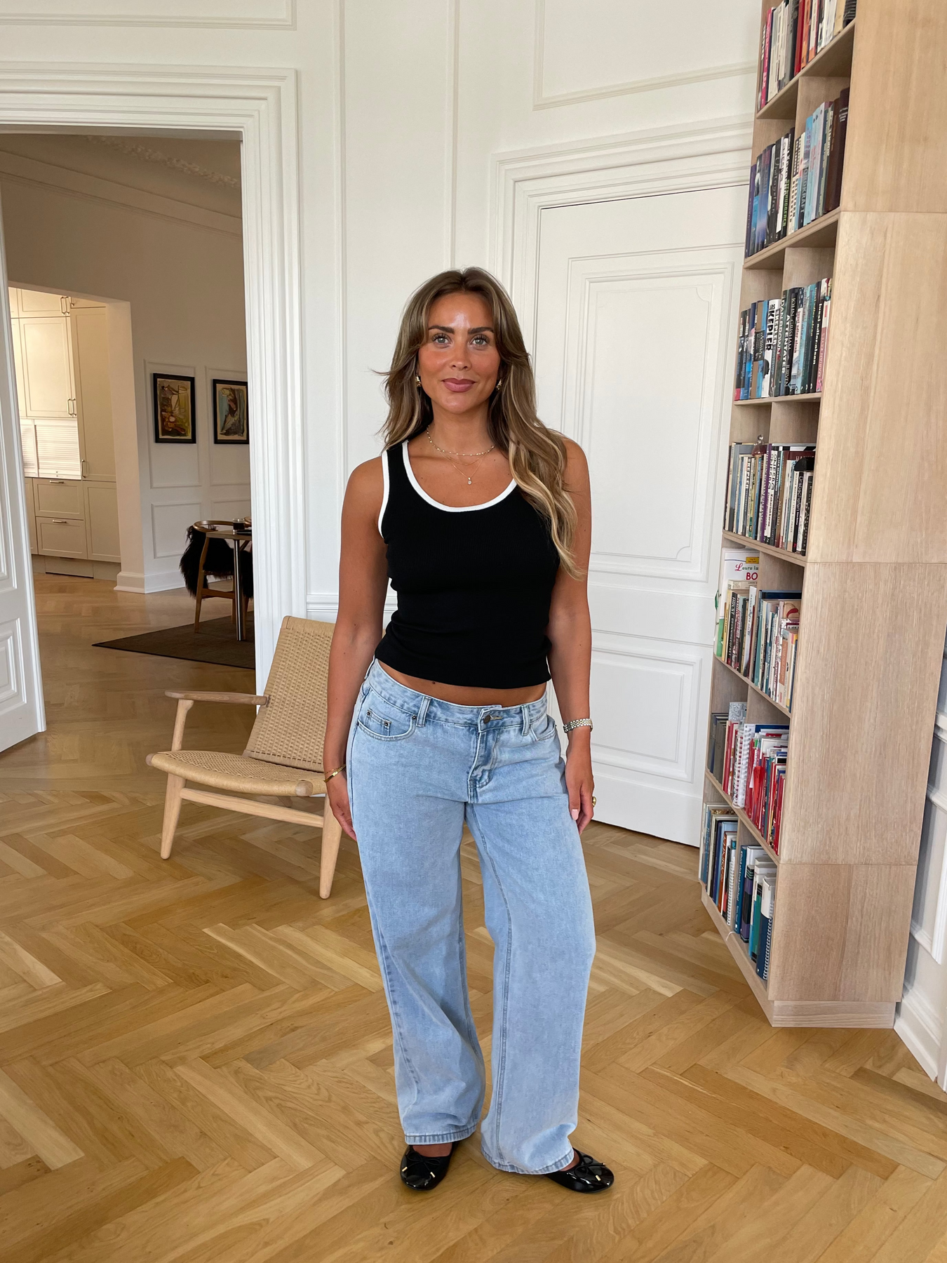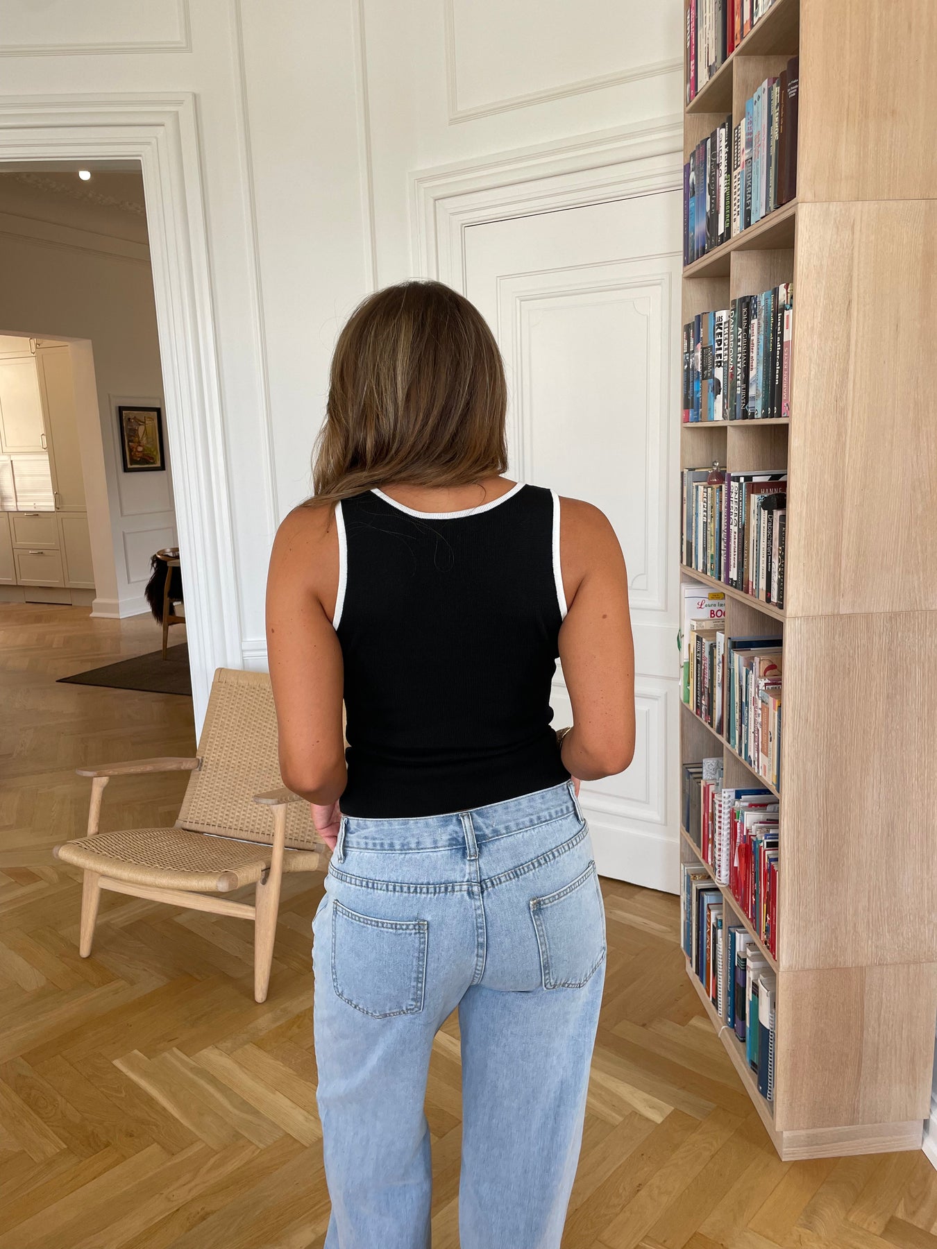 The Tiffany top is a simple yet stylish addition to your wardrobe. It comes in black with delicate white contrasting edges, giving it a classic and fresh look. The top is made from a ribbed knit fabric that is both comfortable and flattering. It is easy to style with anything – wear it with a pair of jeans for a relaxed everyday look, with shorts on warm days, or with a long skirt if you want to dress it up a little. A versatile favorite you can wear again and again🖤
