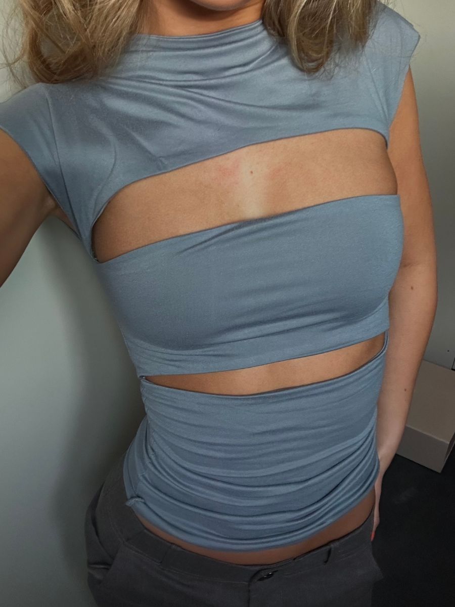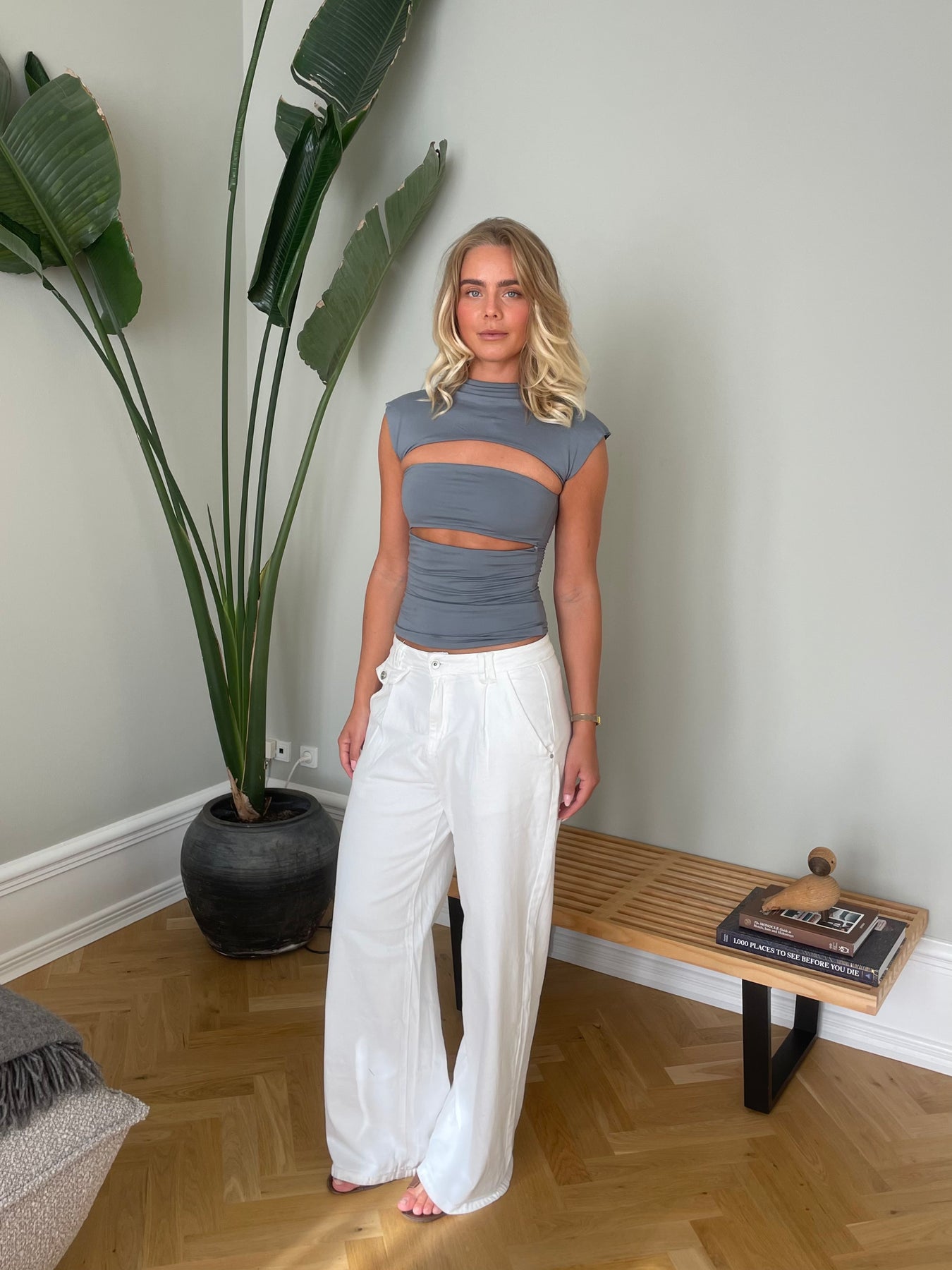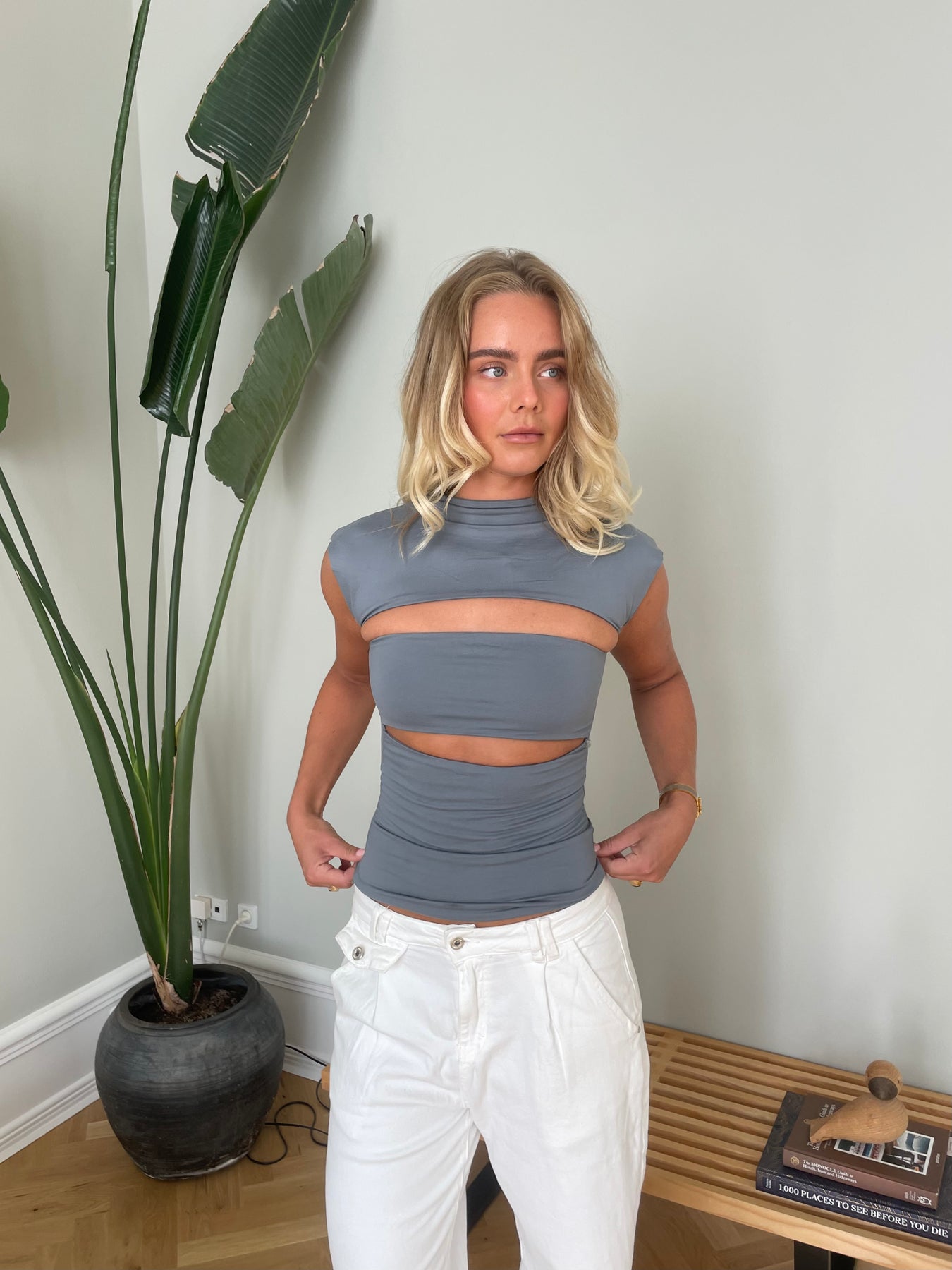 Our Wilma top is a versatile favorite that can be worn both ways, giving you even more options for styling your outfits. It comes in a beautiful greyish shade and has a high neckline that gives it a stylish and elegant look. The two subtle cutouts, which discreetly reveal the skin, add an extra touch of class. The top is close-fitting and made from an elastic material that ensures both comfort and a great fit.